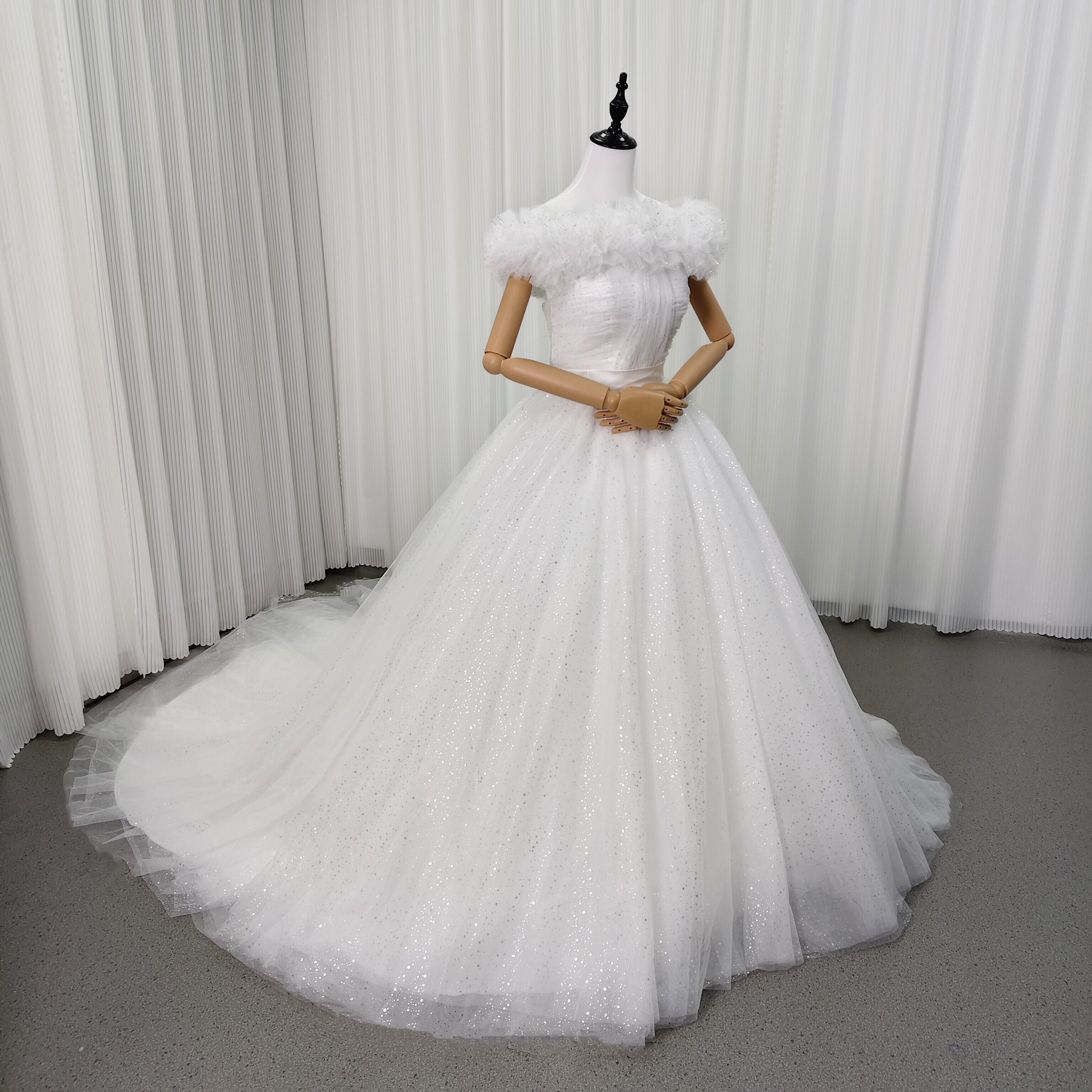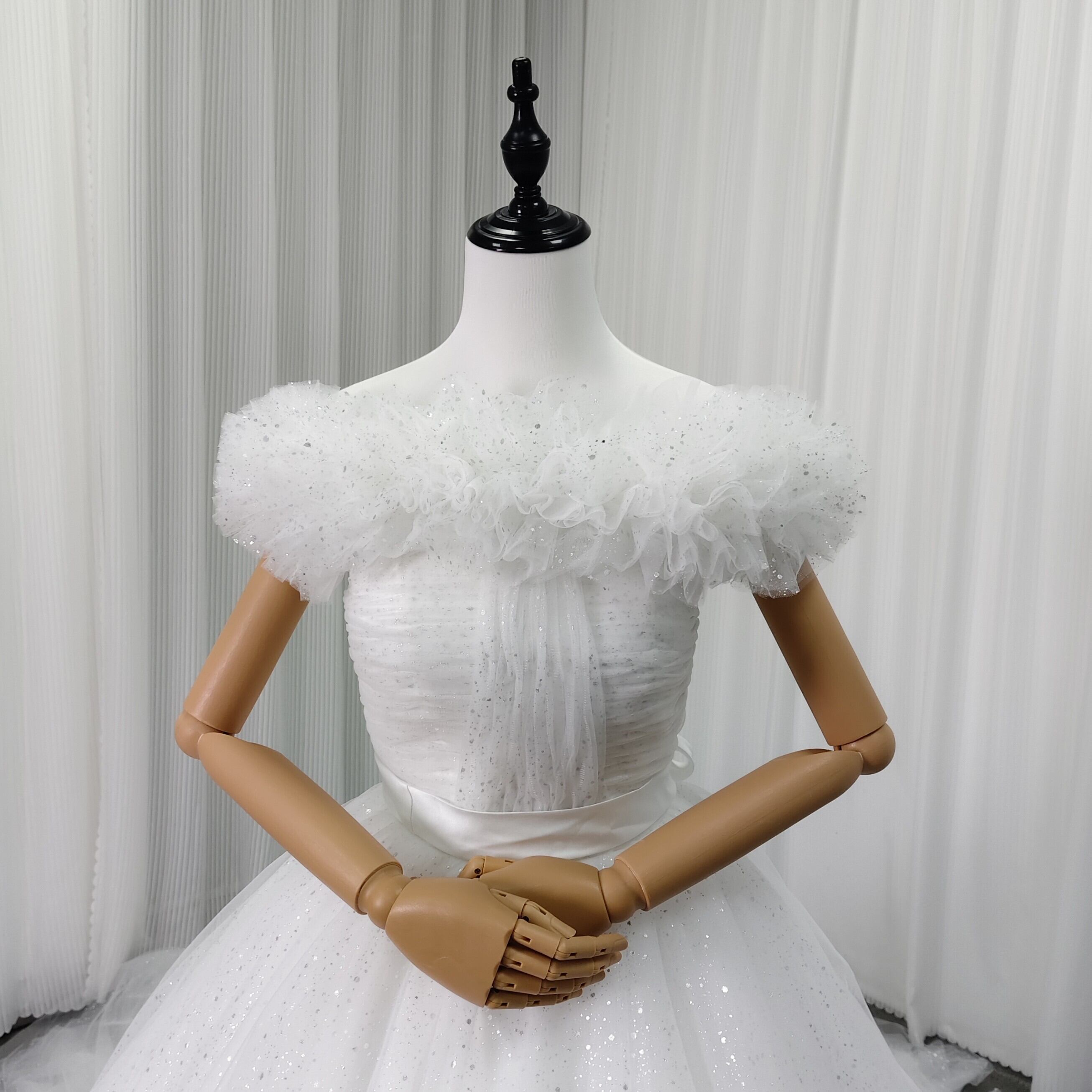 ウェディングドレス 取り外しオフショルダー キラキラチュール フレアスカート 編み上げ 拳式/前撮り