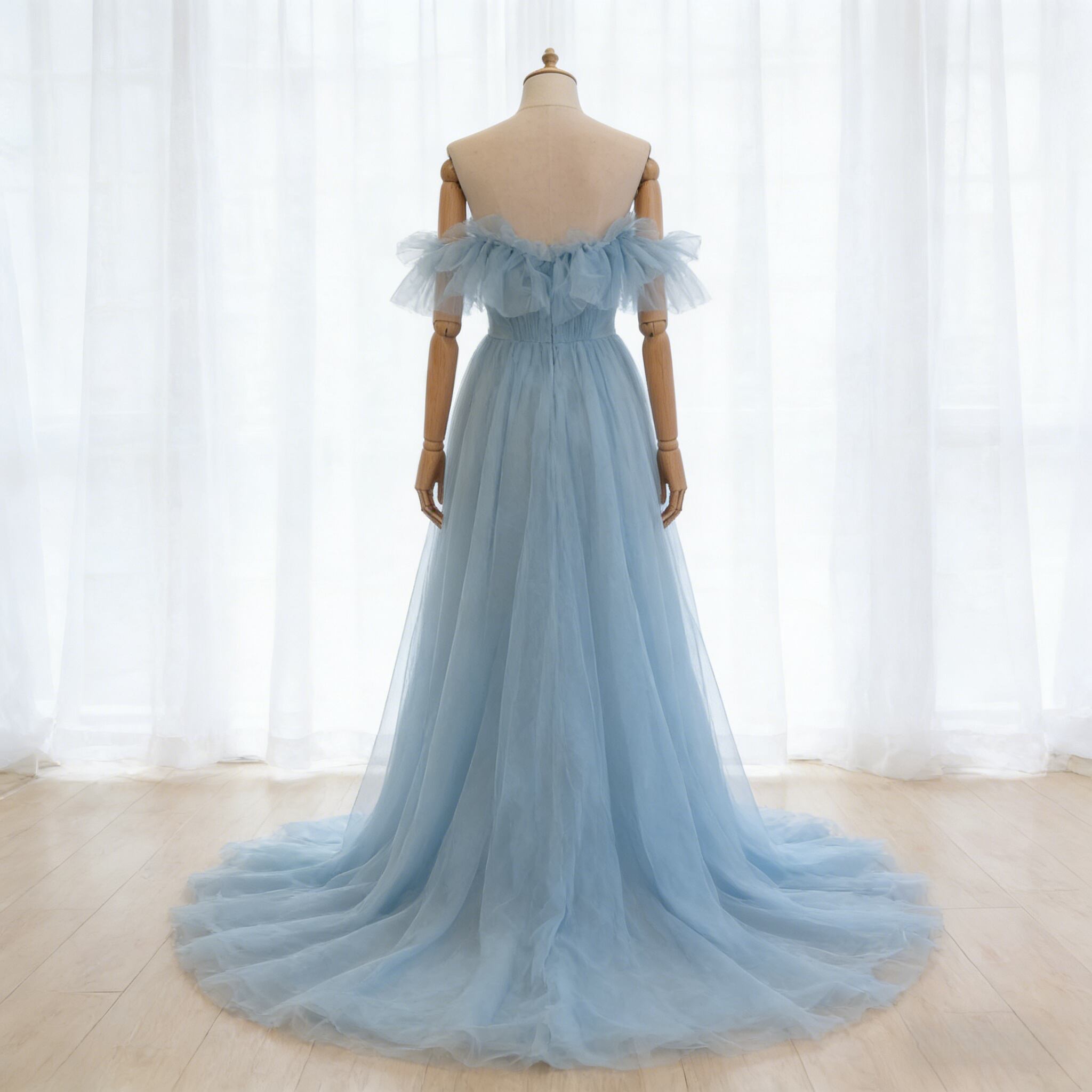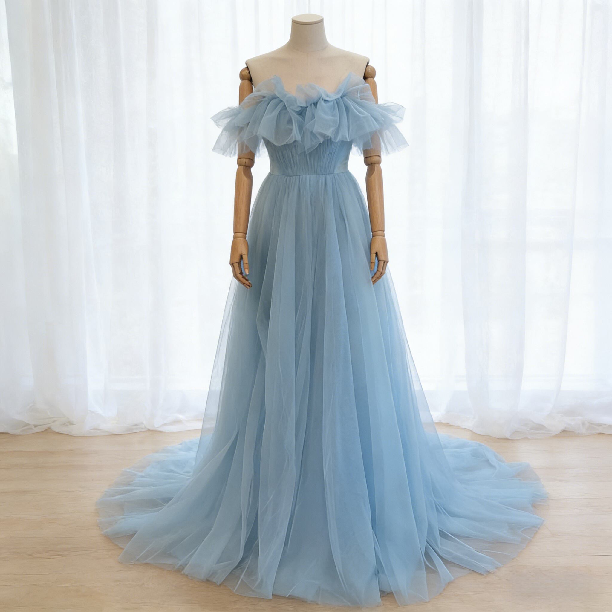 カラードレス 爽やかで優しいブルー オフショルダー チュールスカート ふわふわドレス 披露宴