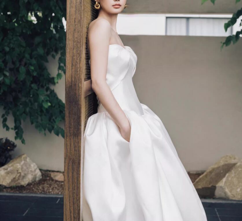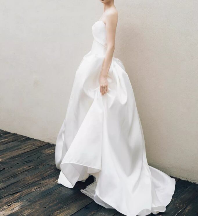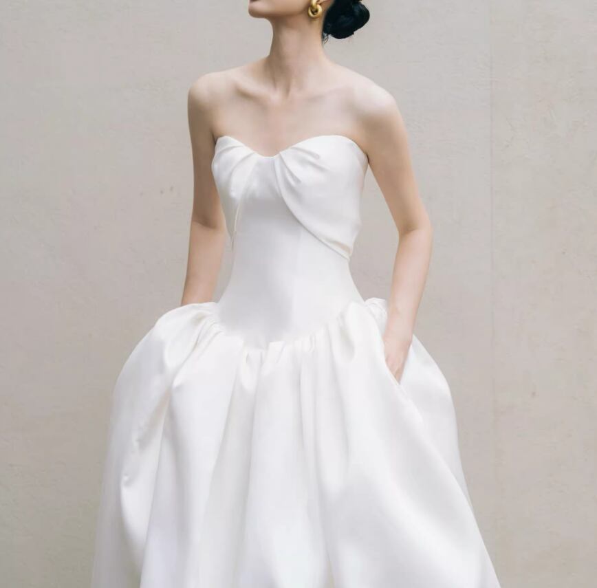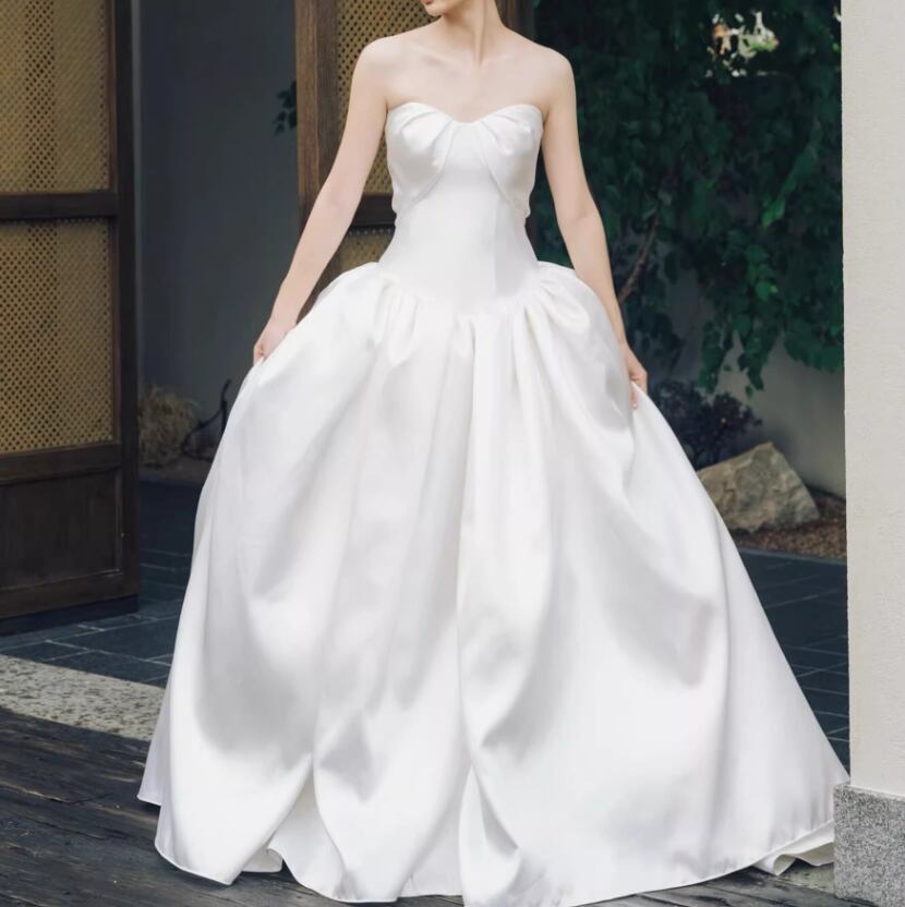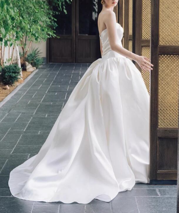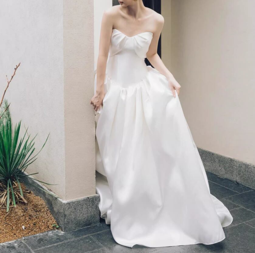 ウェディングドレス ベアトップ 胸元フリル ロイヤルサテン フレアスカート フランス風 拳式/前撮り