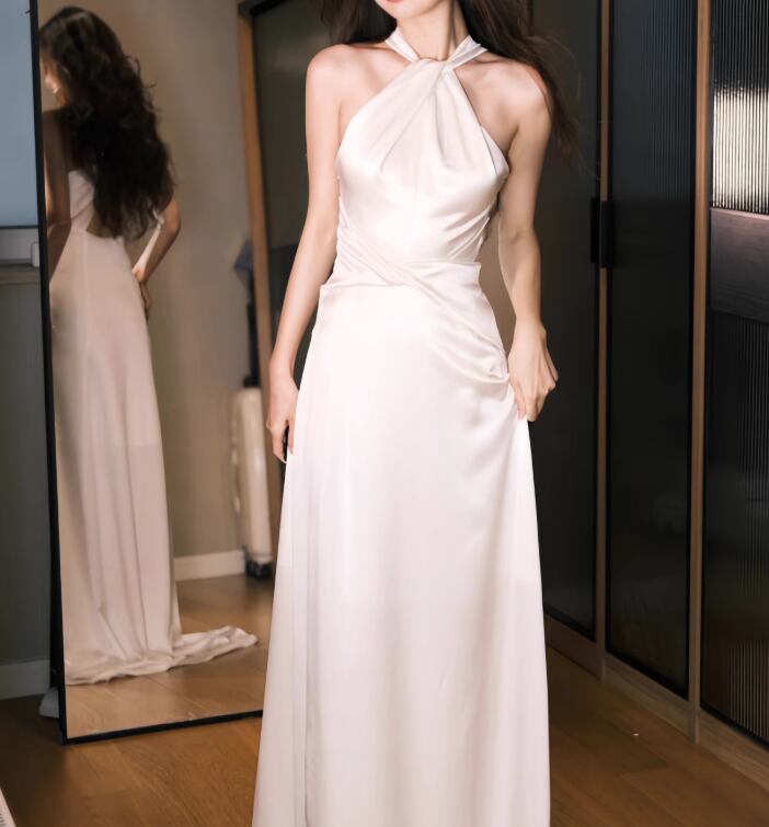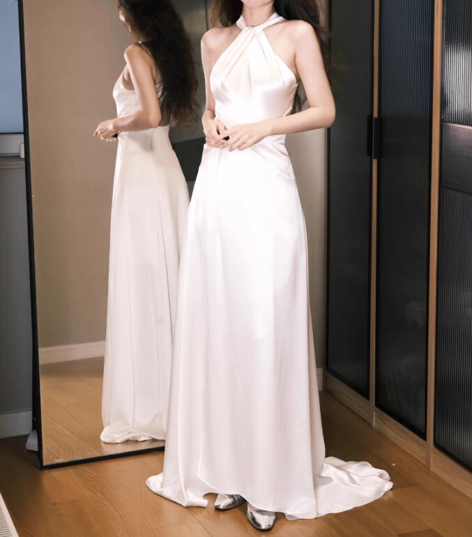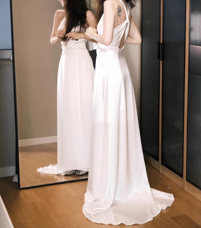 ウェディングドレス ホルターネック 細見えシルエット ミニトレーン 背中見せ 2次会/合コン