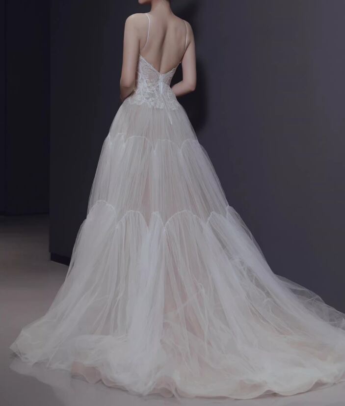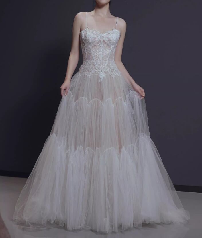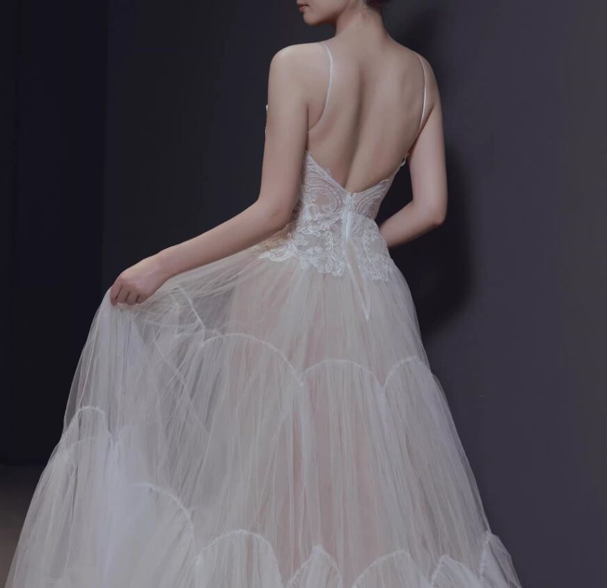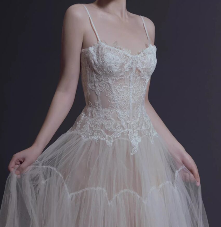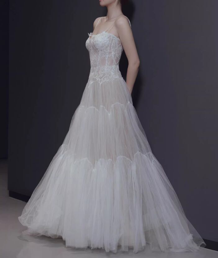 フランス風 ウェディングドレス キャミソール 繊細レース 揺らめく裾 スレンダーライン 2次会/合コン