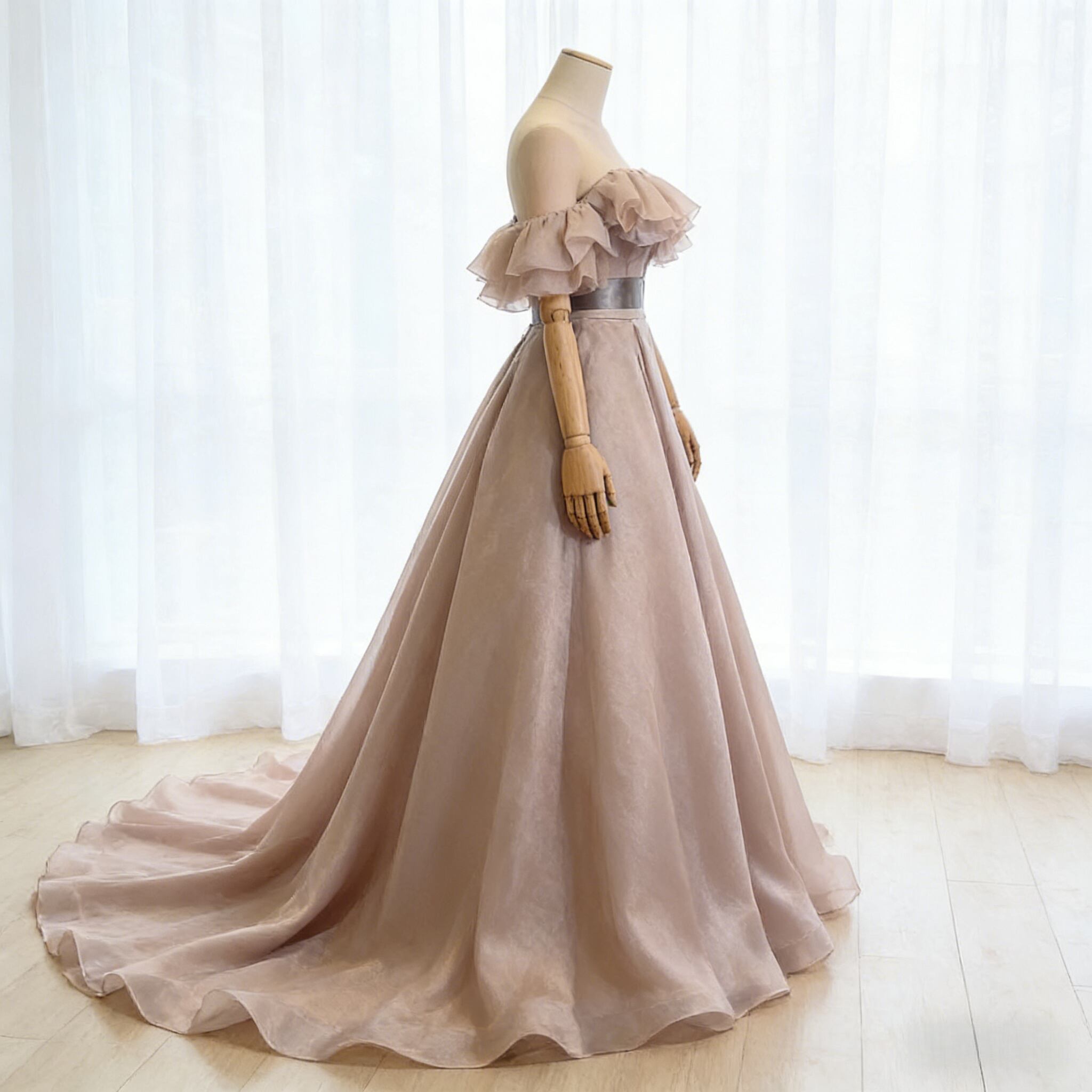 カラードレス シャンパン色 オフショルダー フレアスカート サッシュベルト エレガント 謝恩会