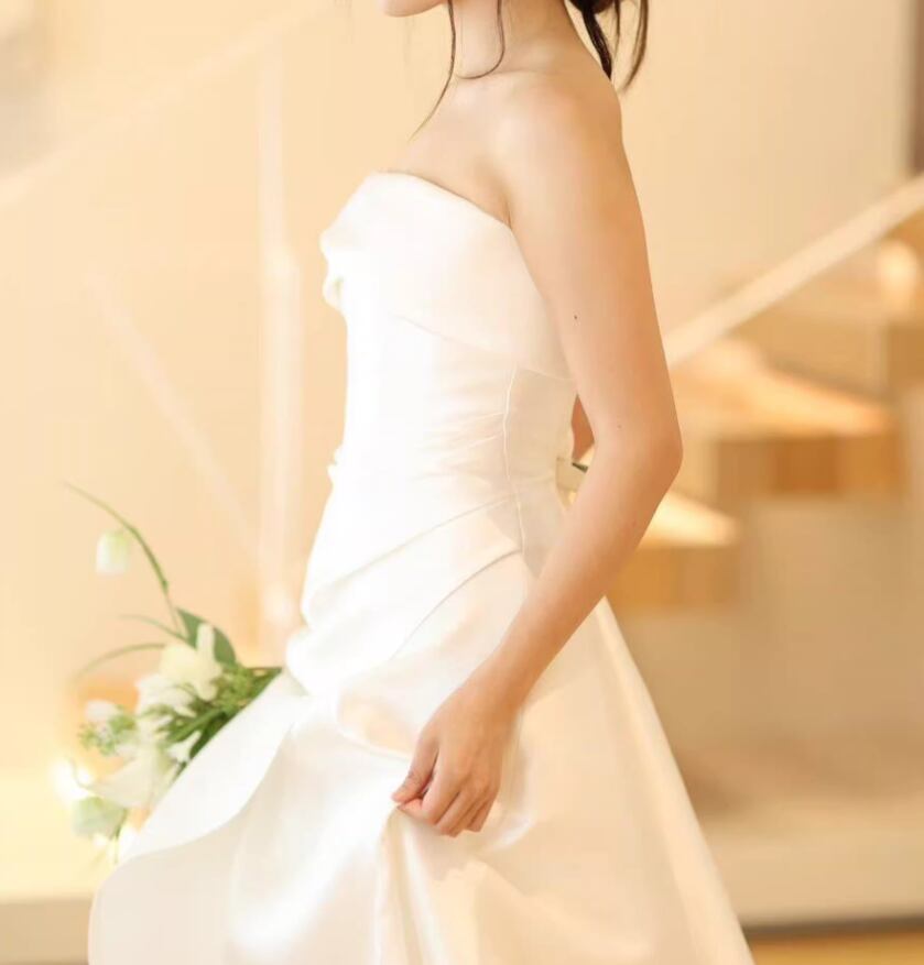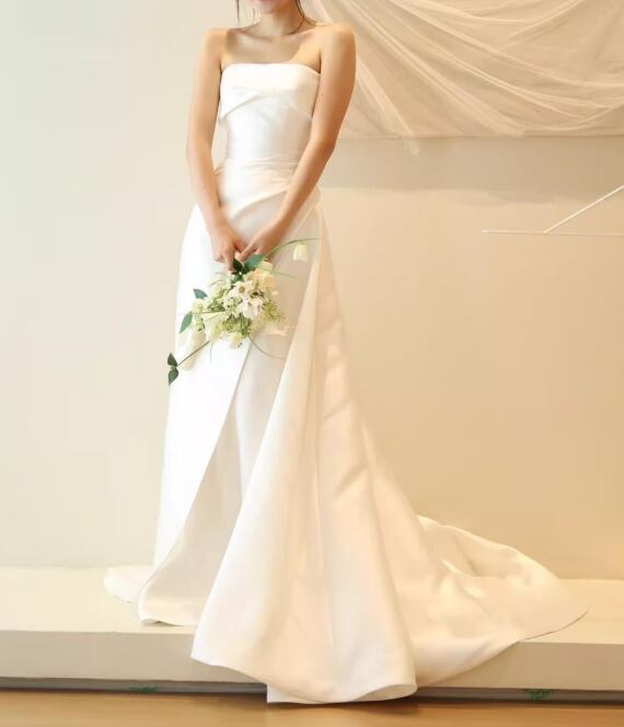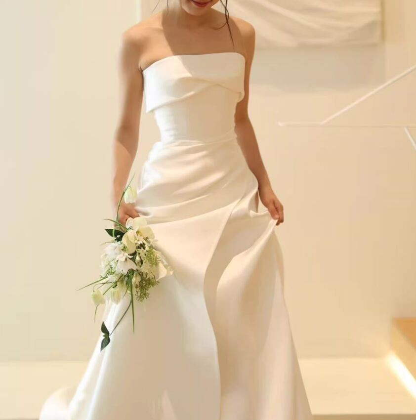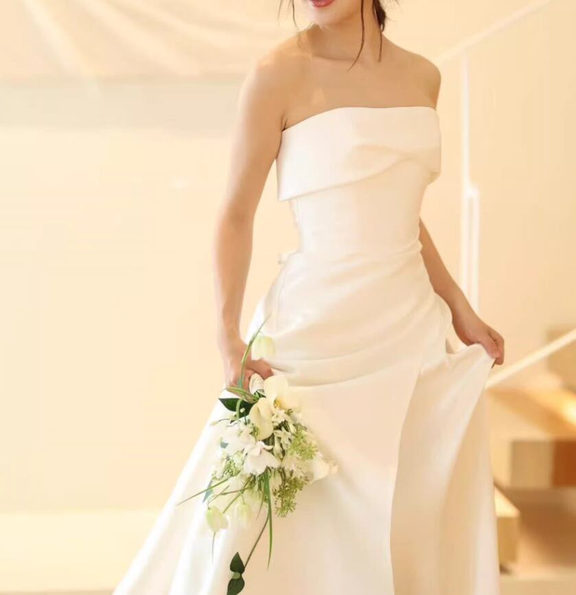 フランス風 ウェディングドレス ベアトップ 細見えシルエット 短トレーン ロイヤルサテン 結婚式