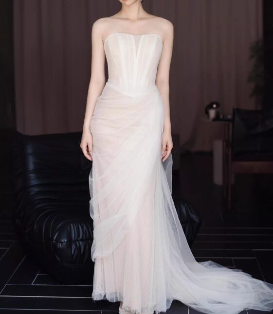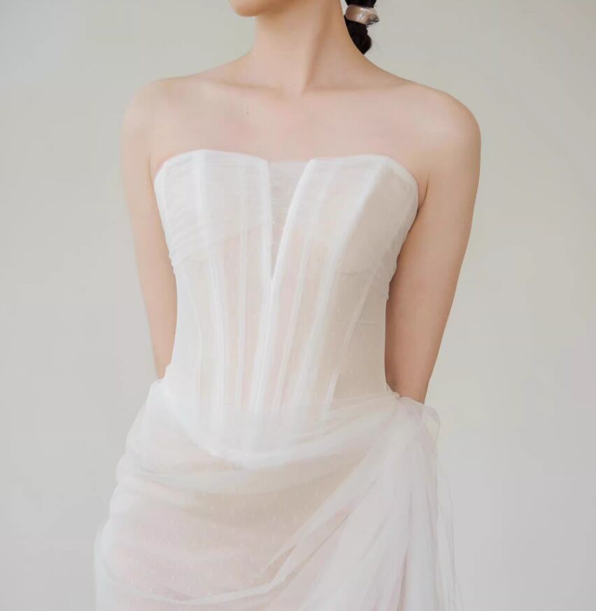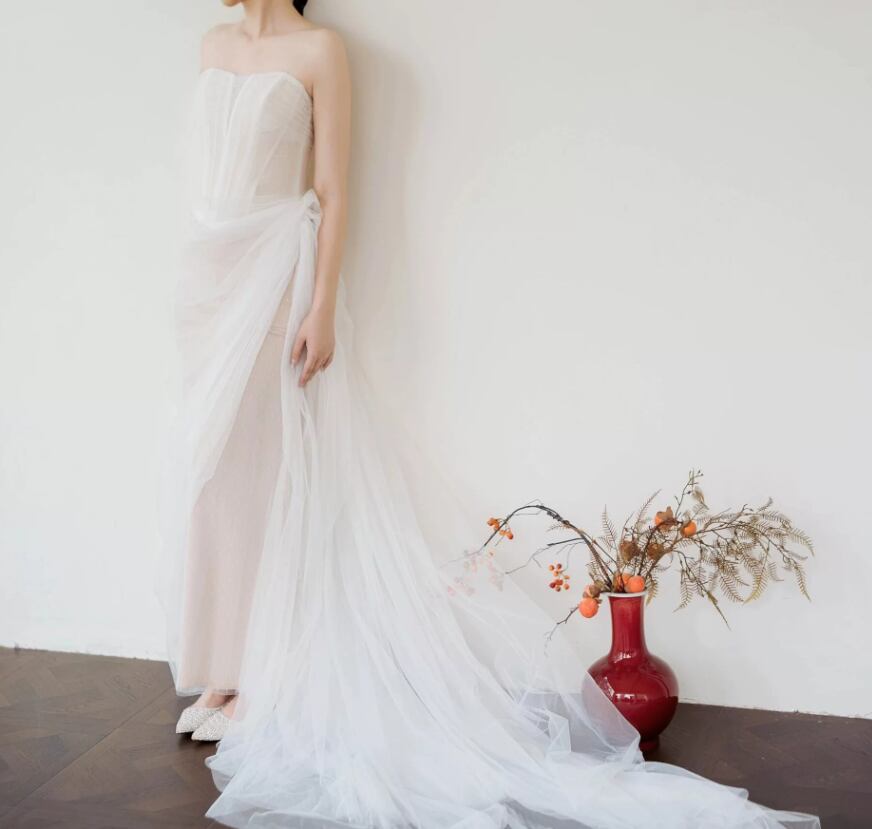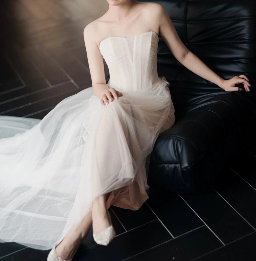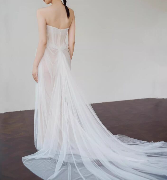 ウェディングドレス ベアトップ ソフトチュール ロングトレーン ふわふわドレス 大人っぽい 結婚式