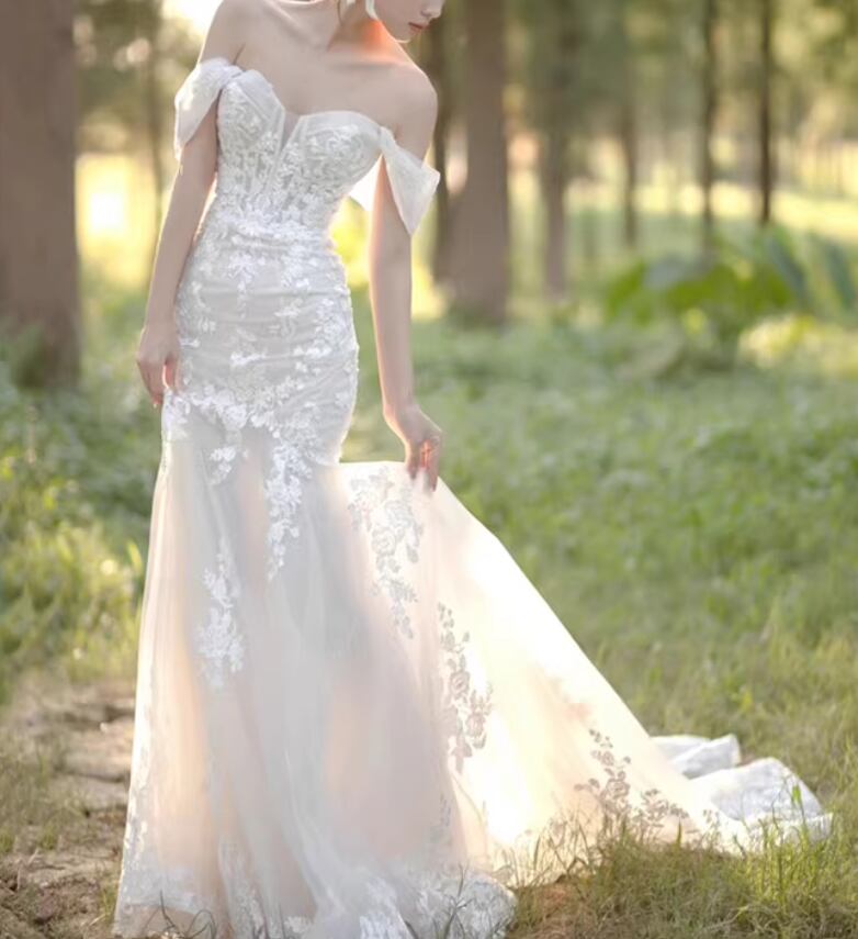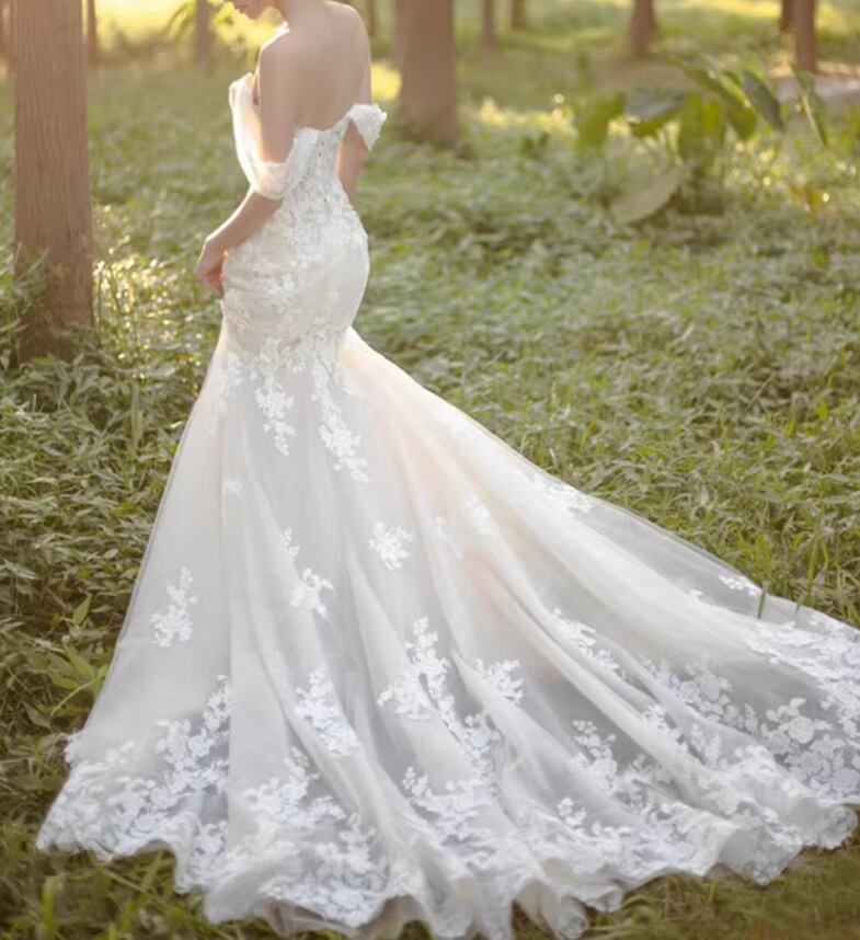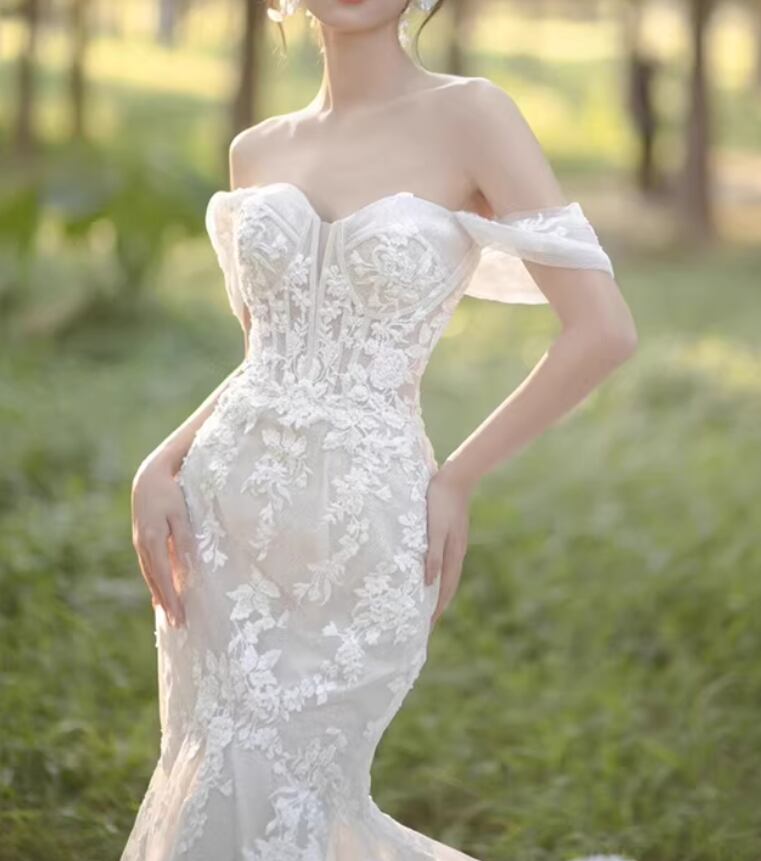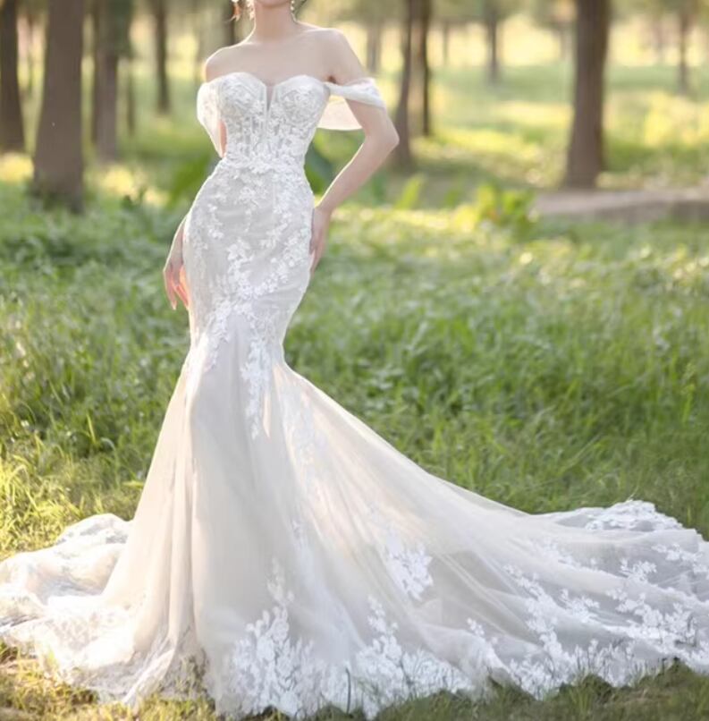 ウェディングドレス オフショルダー マーメイドライン 贅沢な小花総レース 優しい 華やかなトレーン 拳式/前撮り