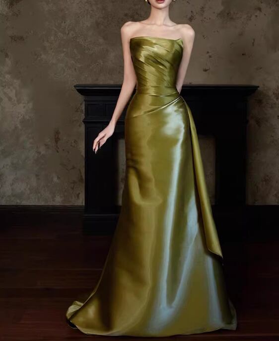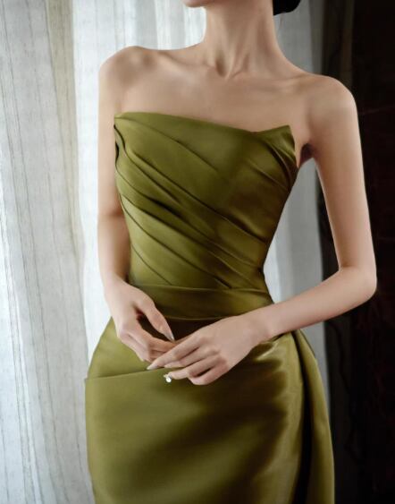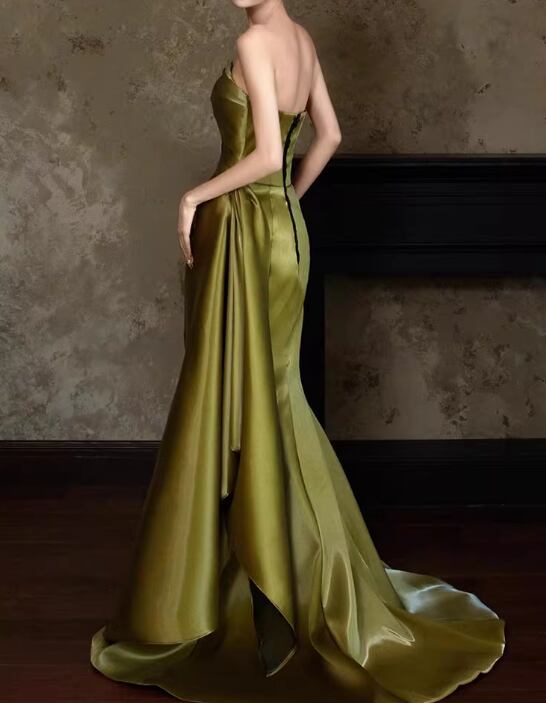 カラードレス 深めな緑 光沢サテン ベアトップ マーメイドライン ハンドドレープ ミニトレーン 披露宴