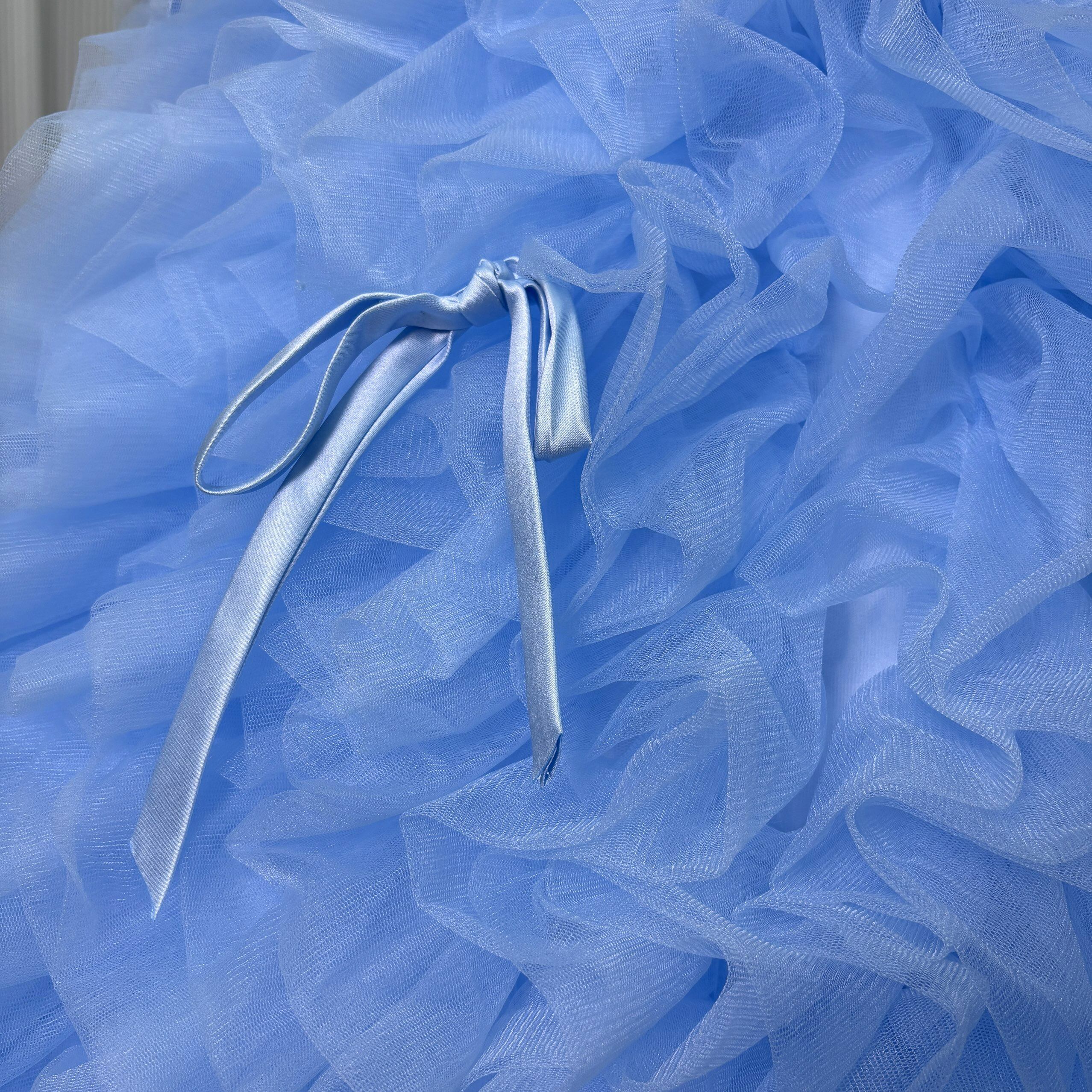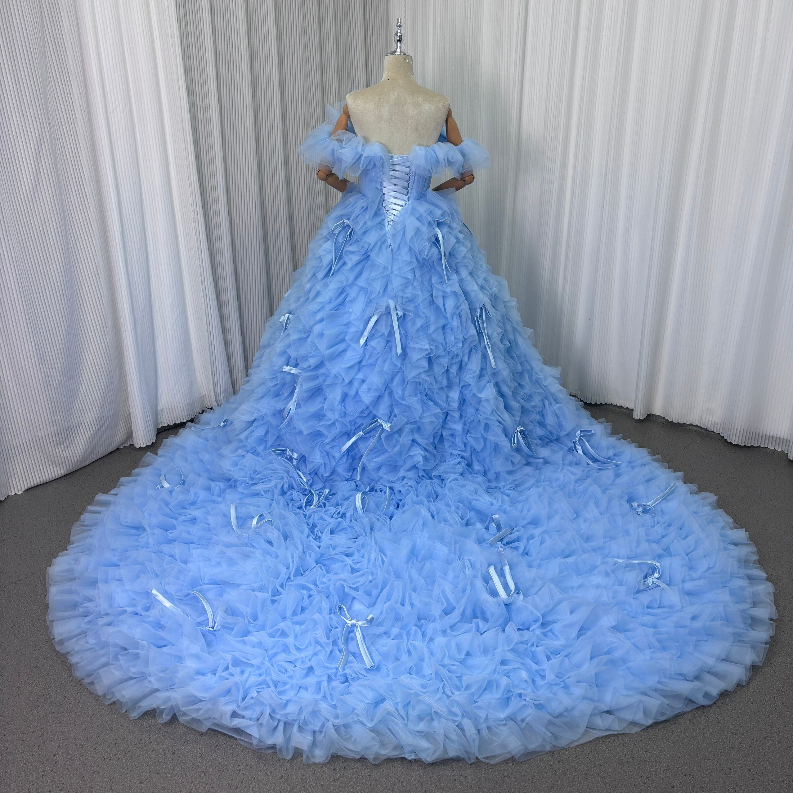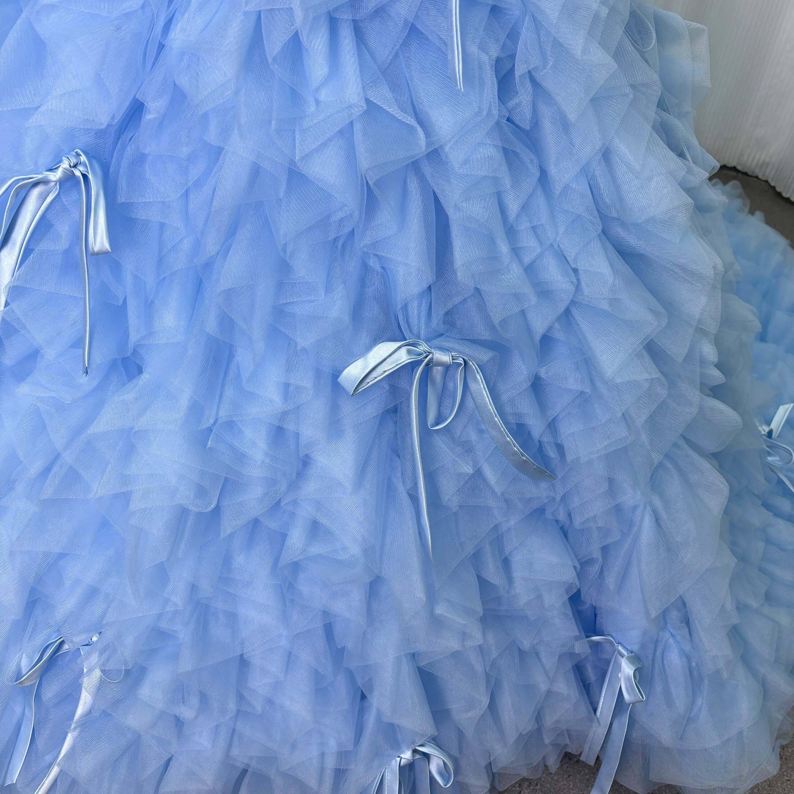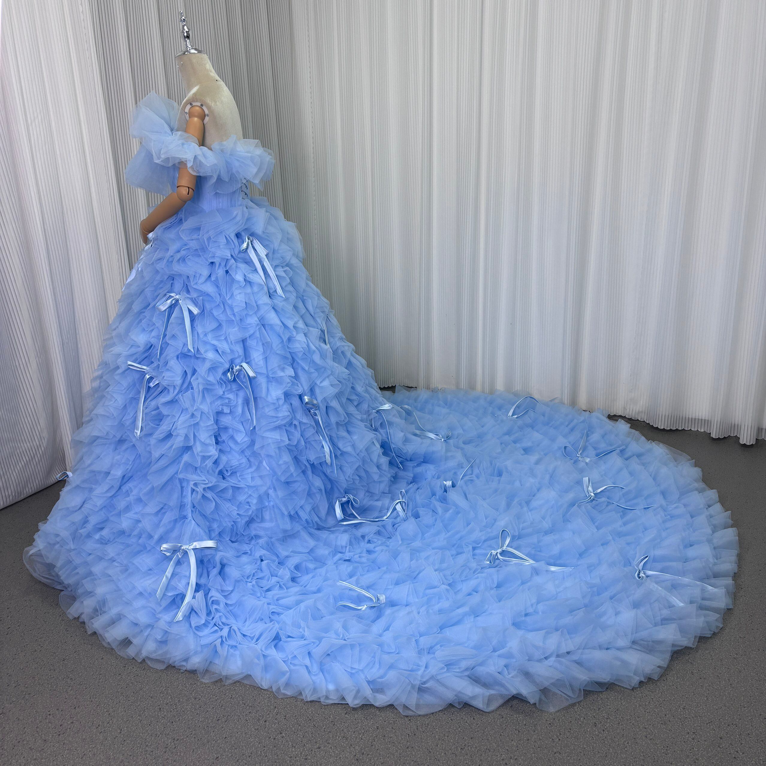 カラードレス ブルー オフショルダー リボン 柔らかく重ねたチュールスカート フレアスカート ロングトレーン 花嫁 前撮り