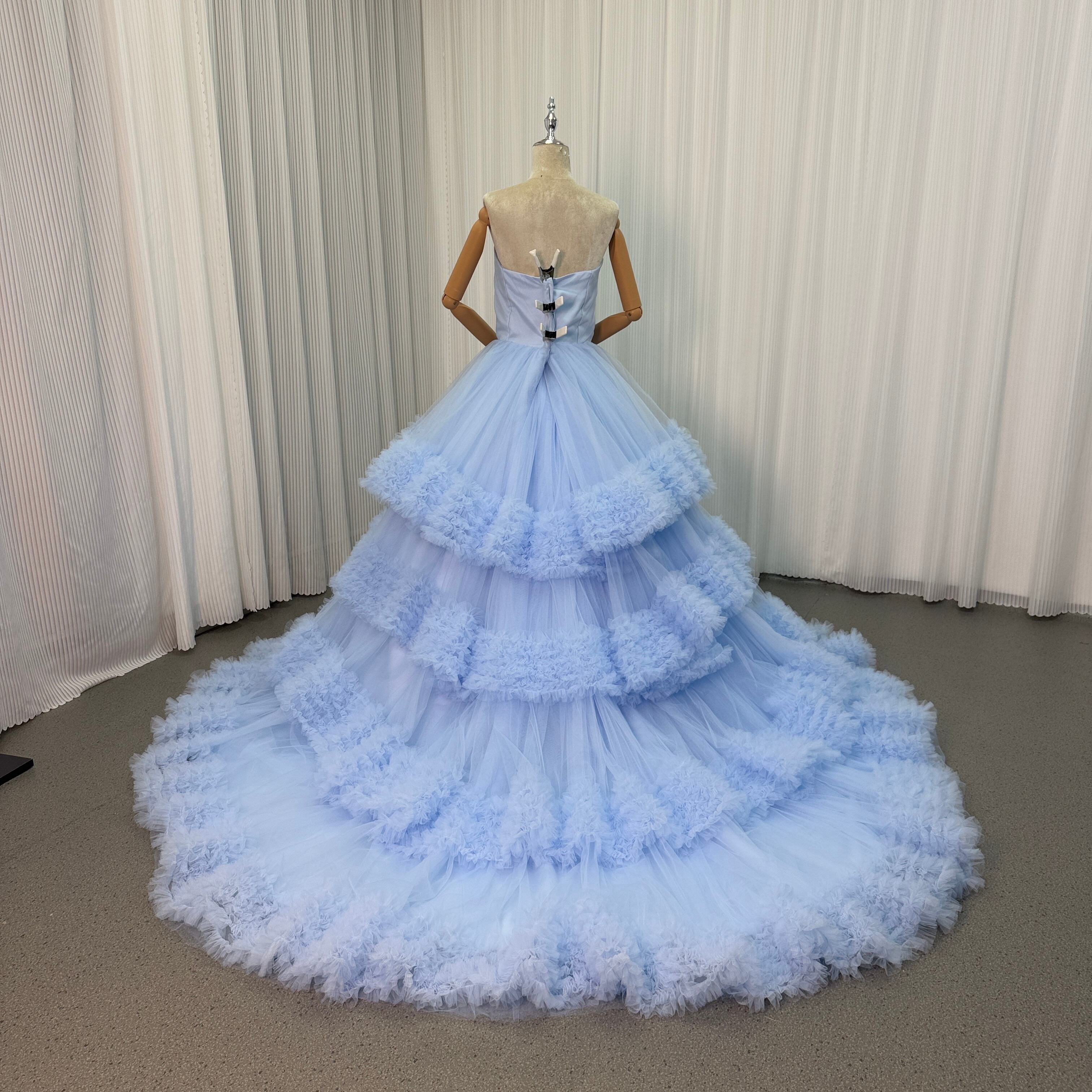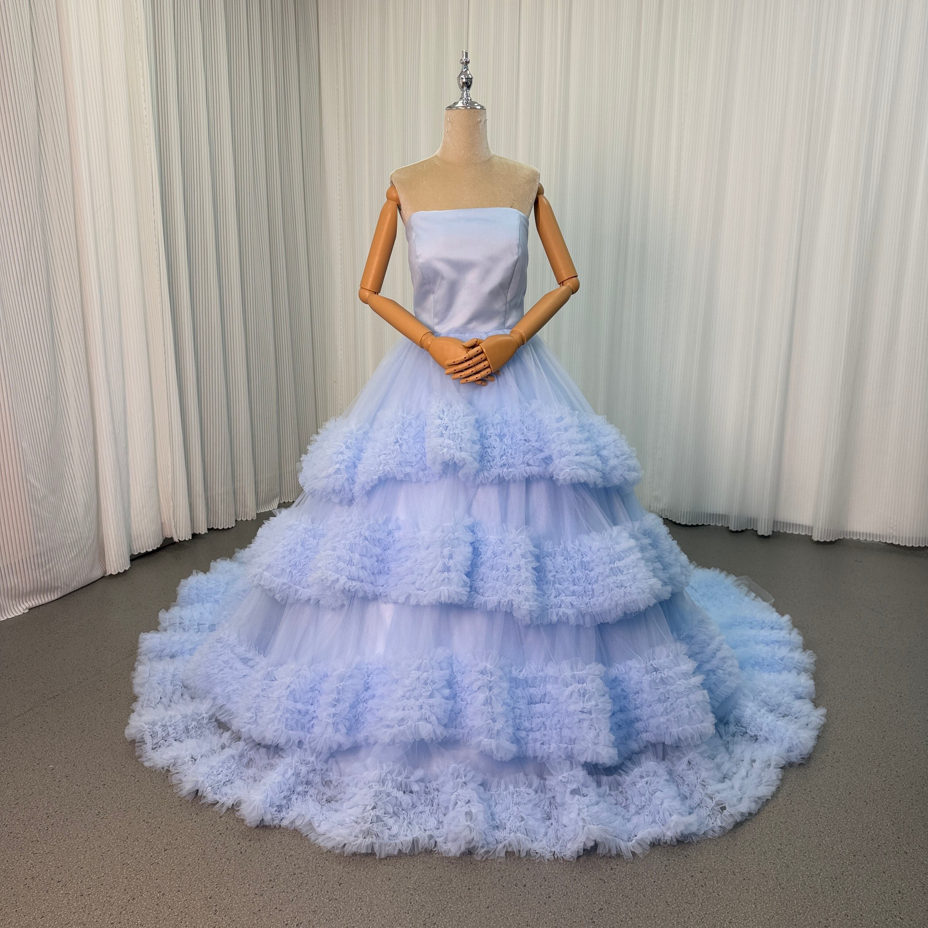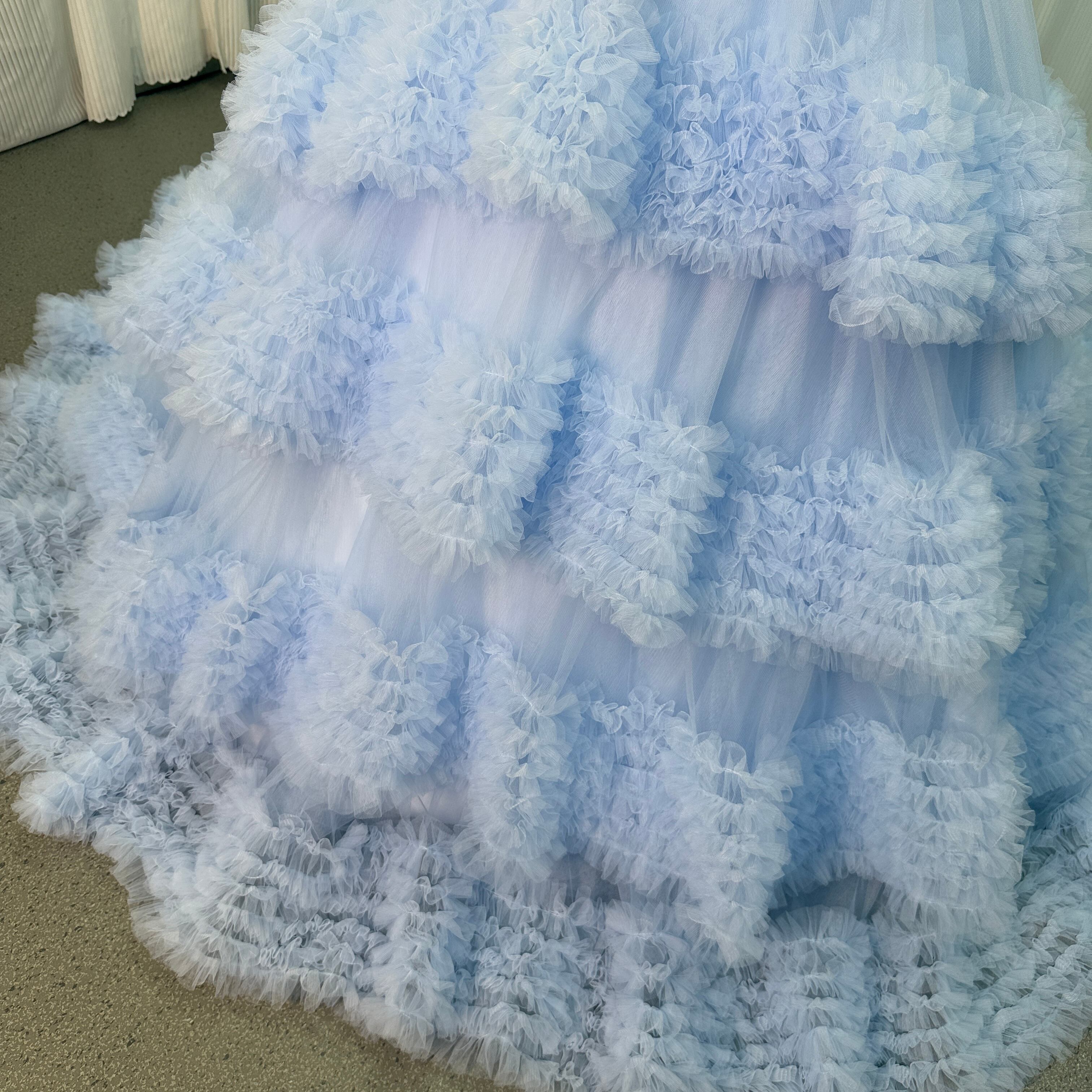 フランス風 カラードレス ブルー ベアトップ ラッフルフリル プリンセスライン デザイン感 披露宴