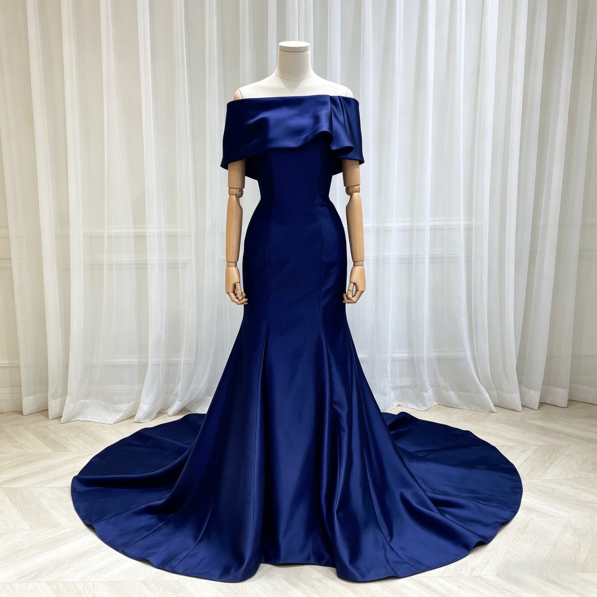 カラードレス ジュエルブルー オフショルダー マーメイドライン ハンドドレープ 光沢サテン ファスナー 披露宴