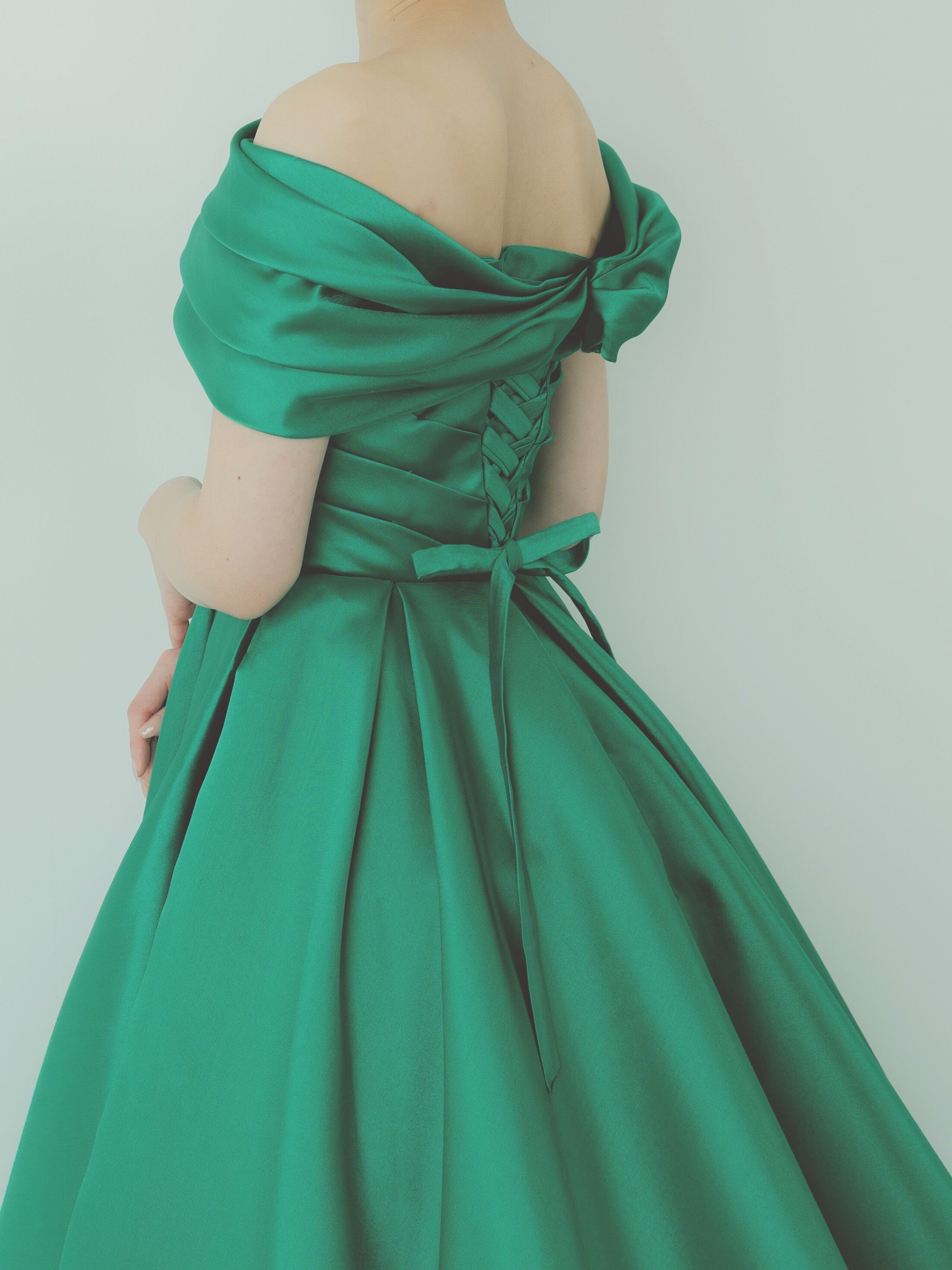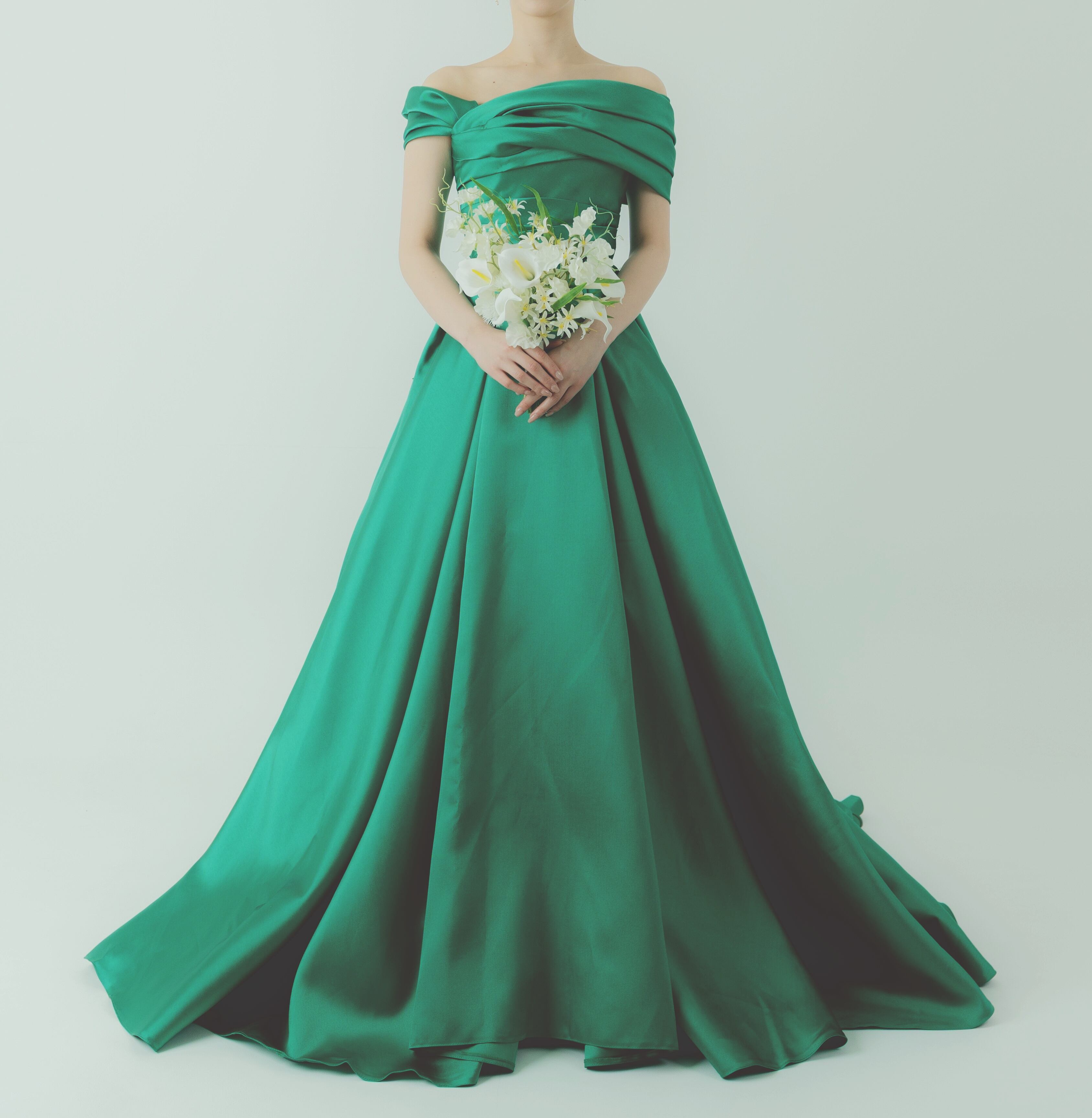 カラードレス グリーン ロイヤルサテン オフショルダー ハンドドレープ ロングトレーン Aライン 披露宴