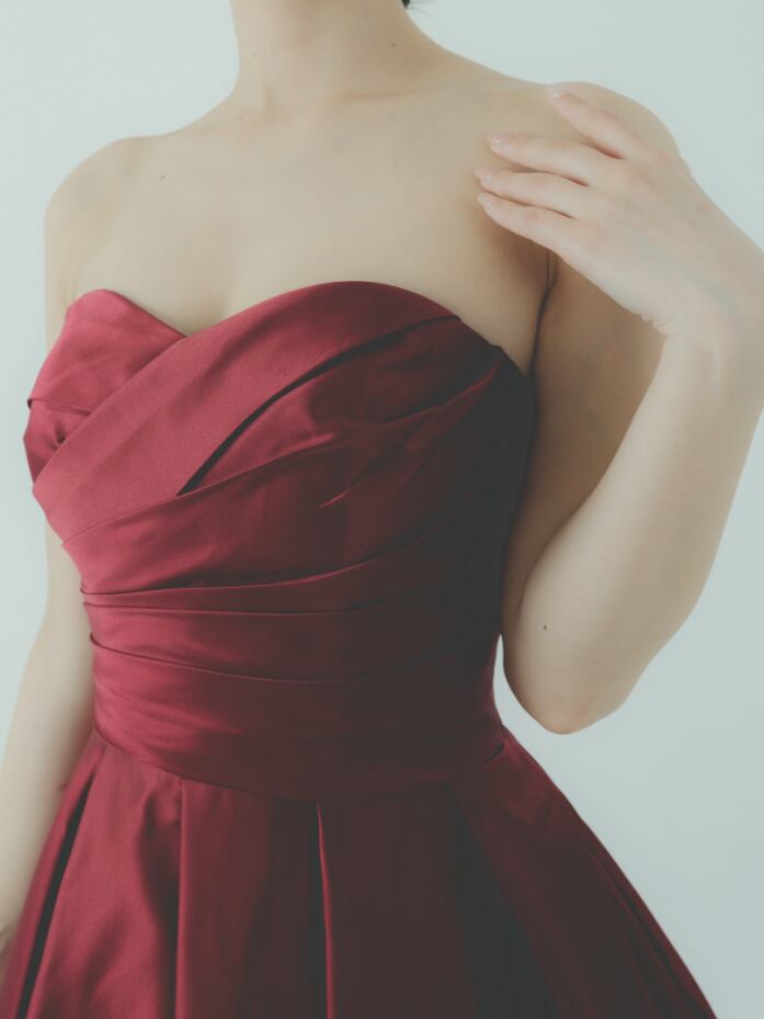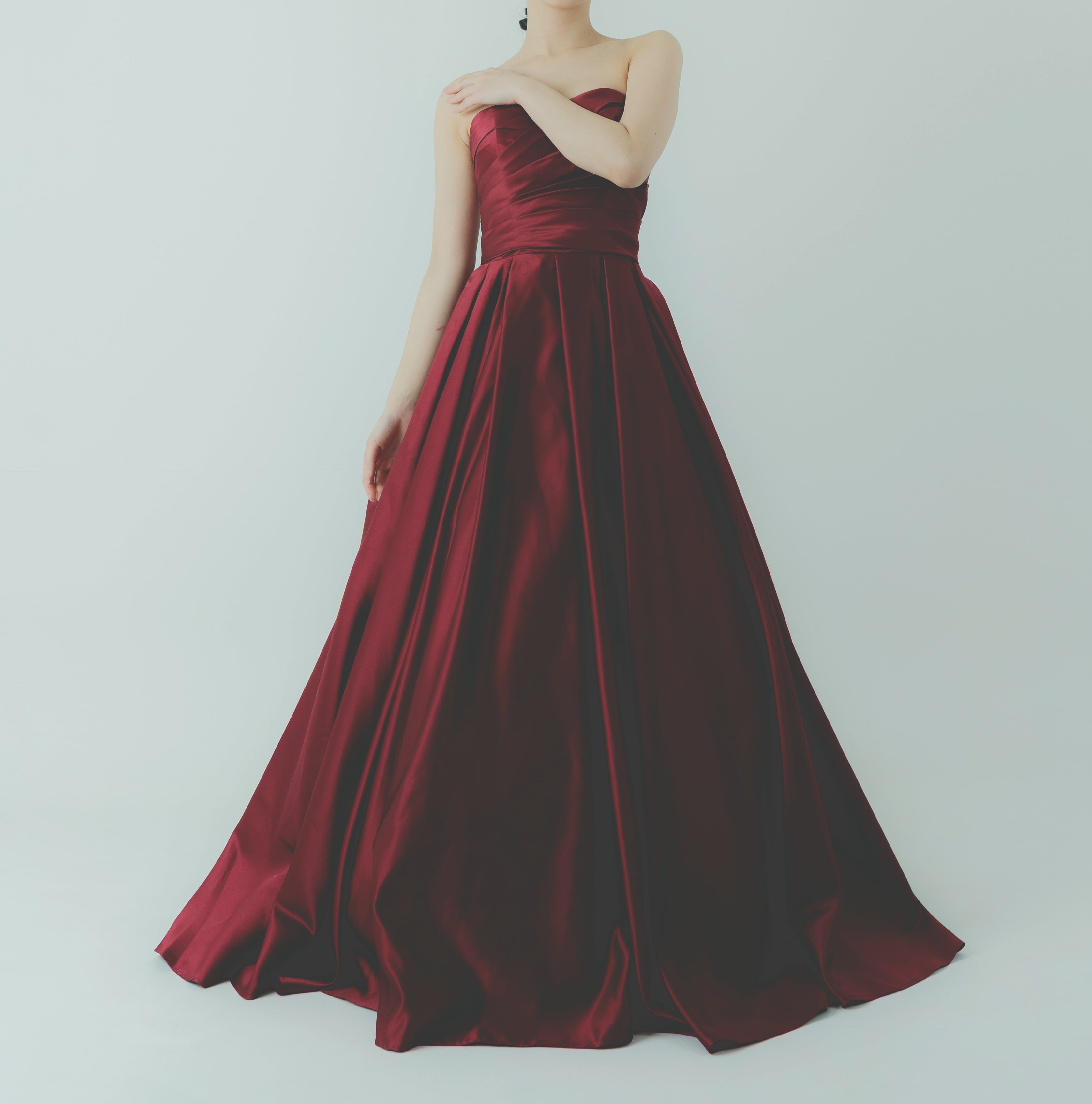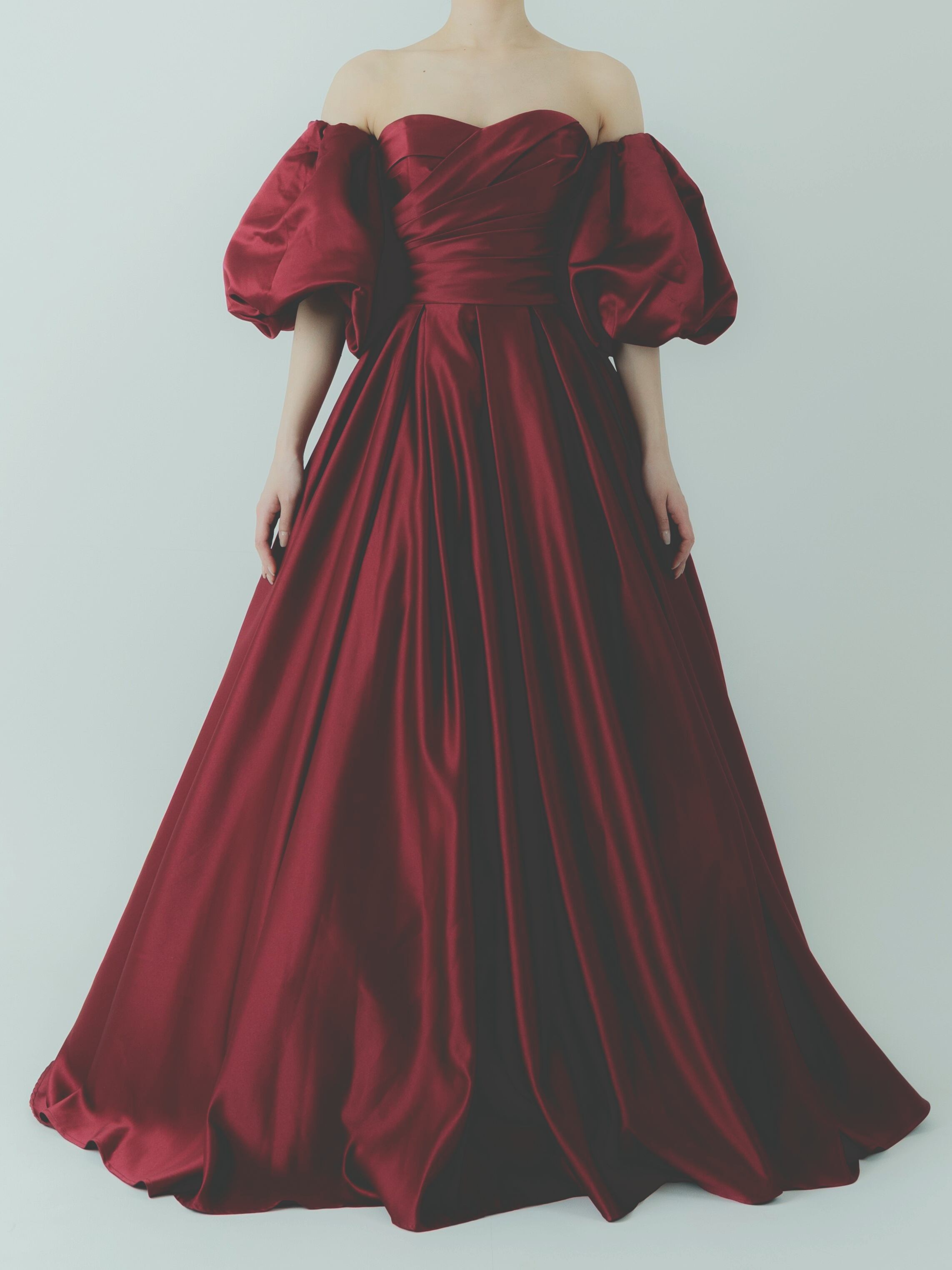カラードレス ワインレッド 光沢サテン ベアトップ パフスリーブ ロングトレーン 編み上げ 披露宴