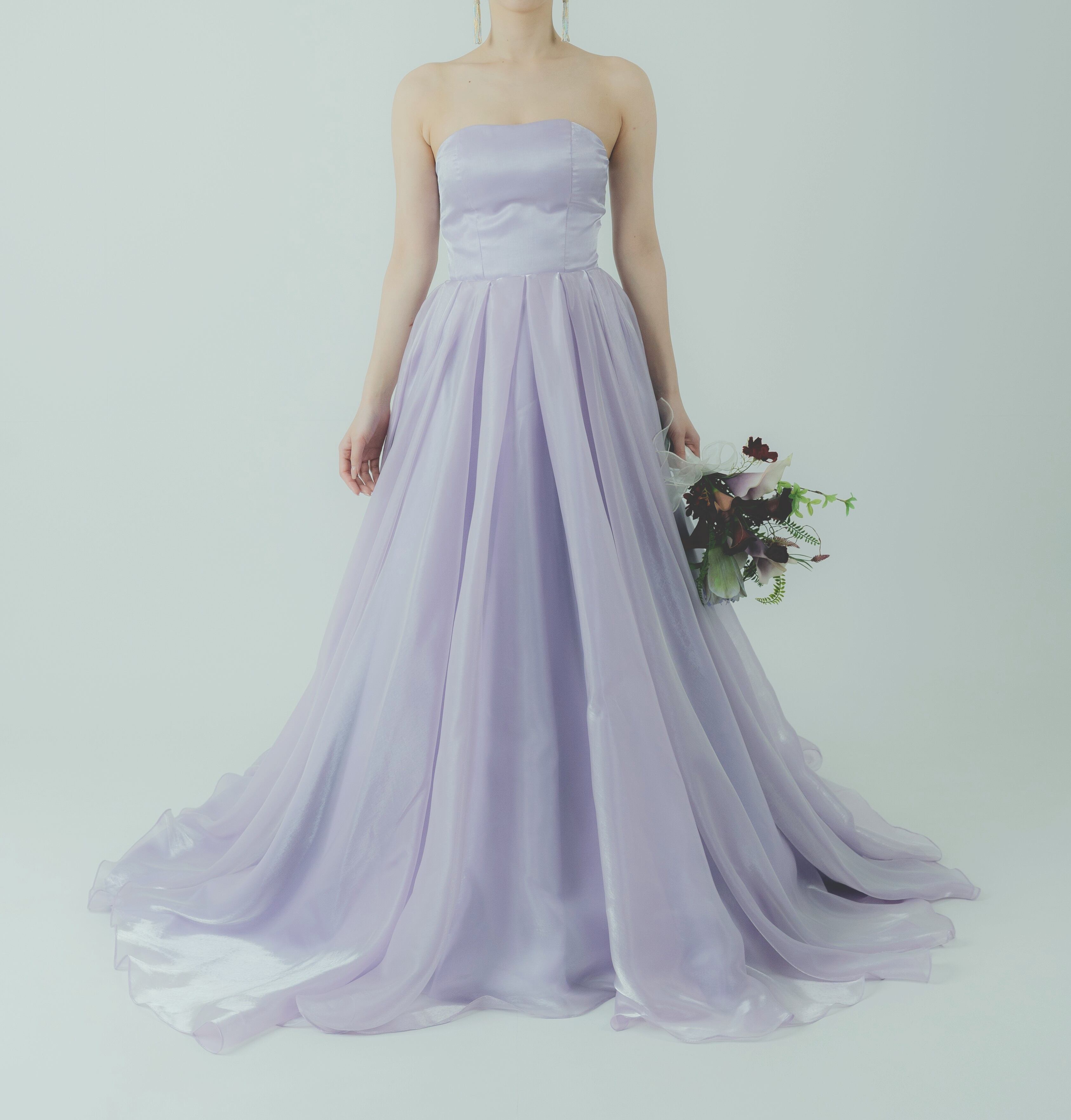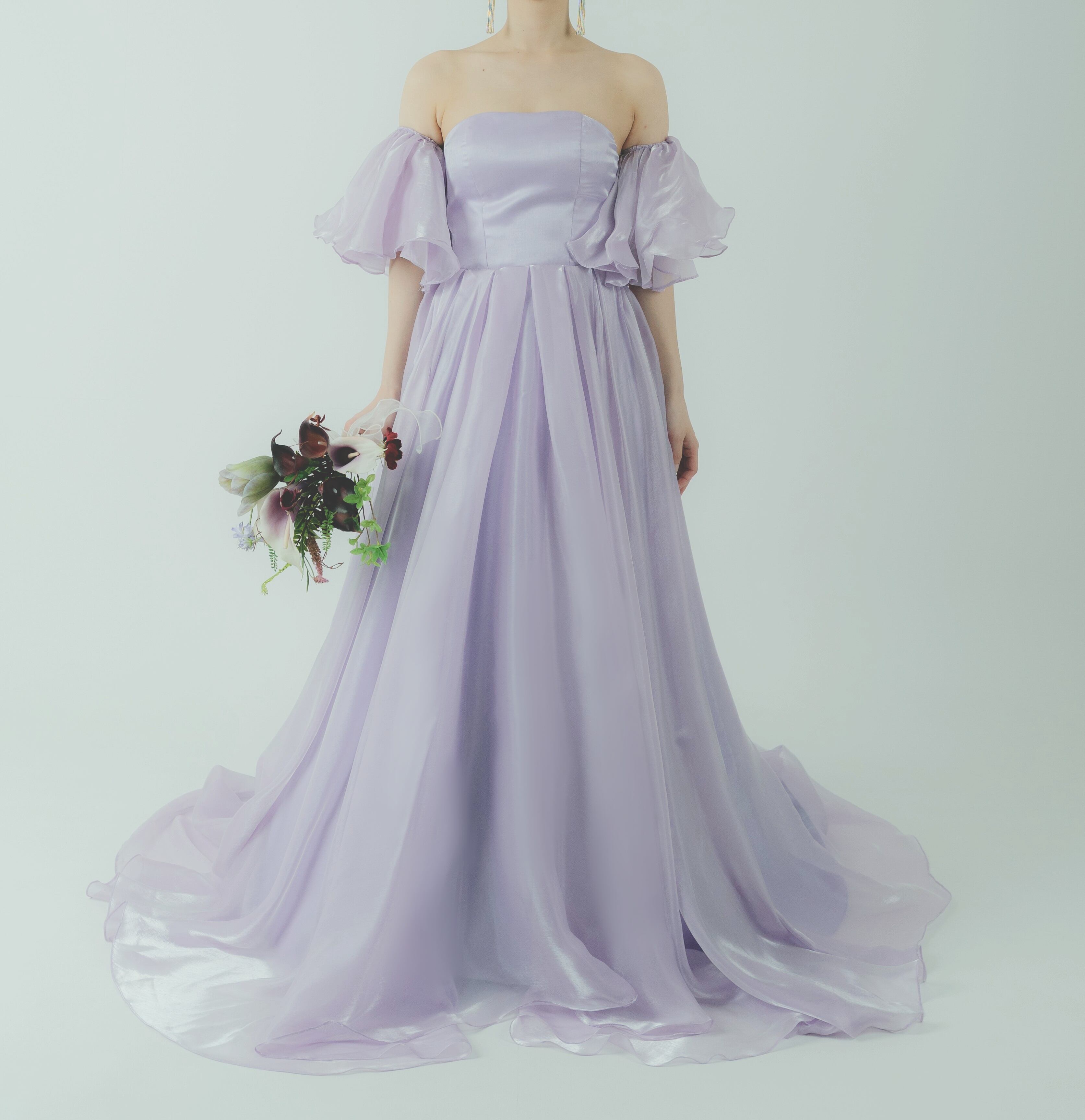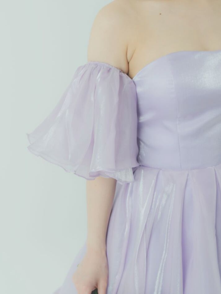 カラードレス オーキッド ベアトップ パフスリーブ 光沢感 ロングトレーン ふわふわドレス 編み上げ 披露宴
