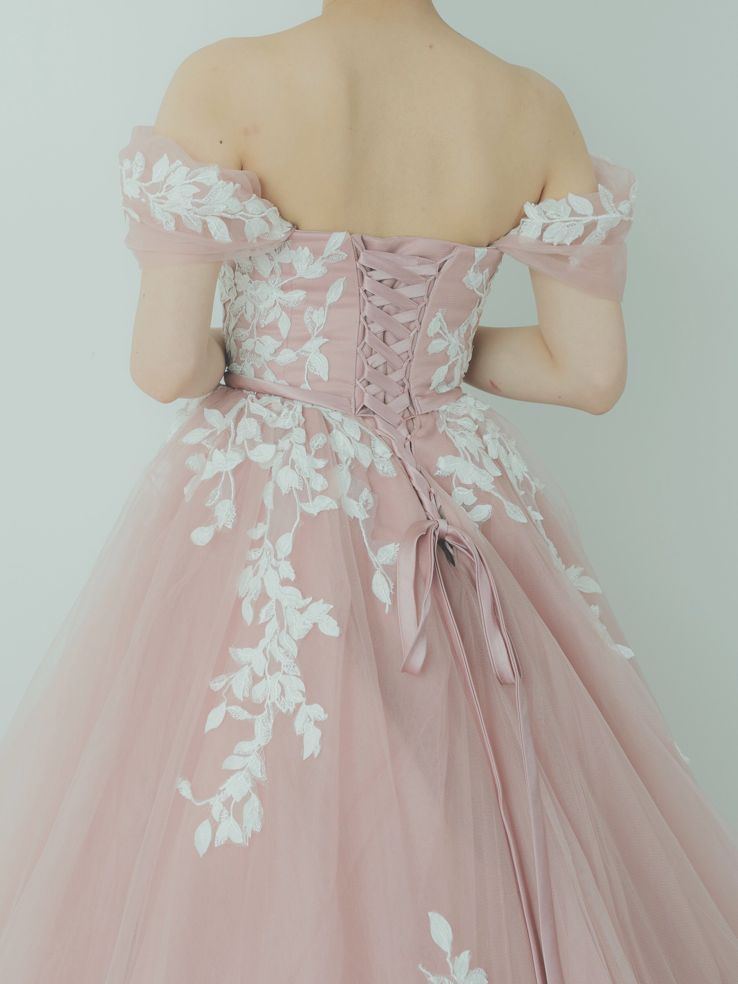 カラードレス ピンク オフショルダー リーフ刺繍 チュールスカート ロングトレーン 編み上げ 披露宴