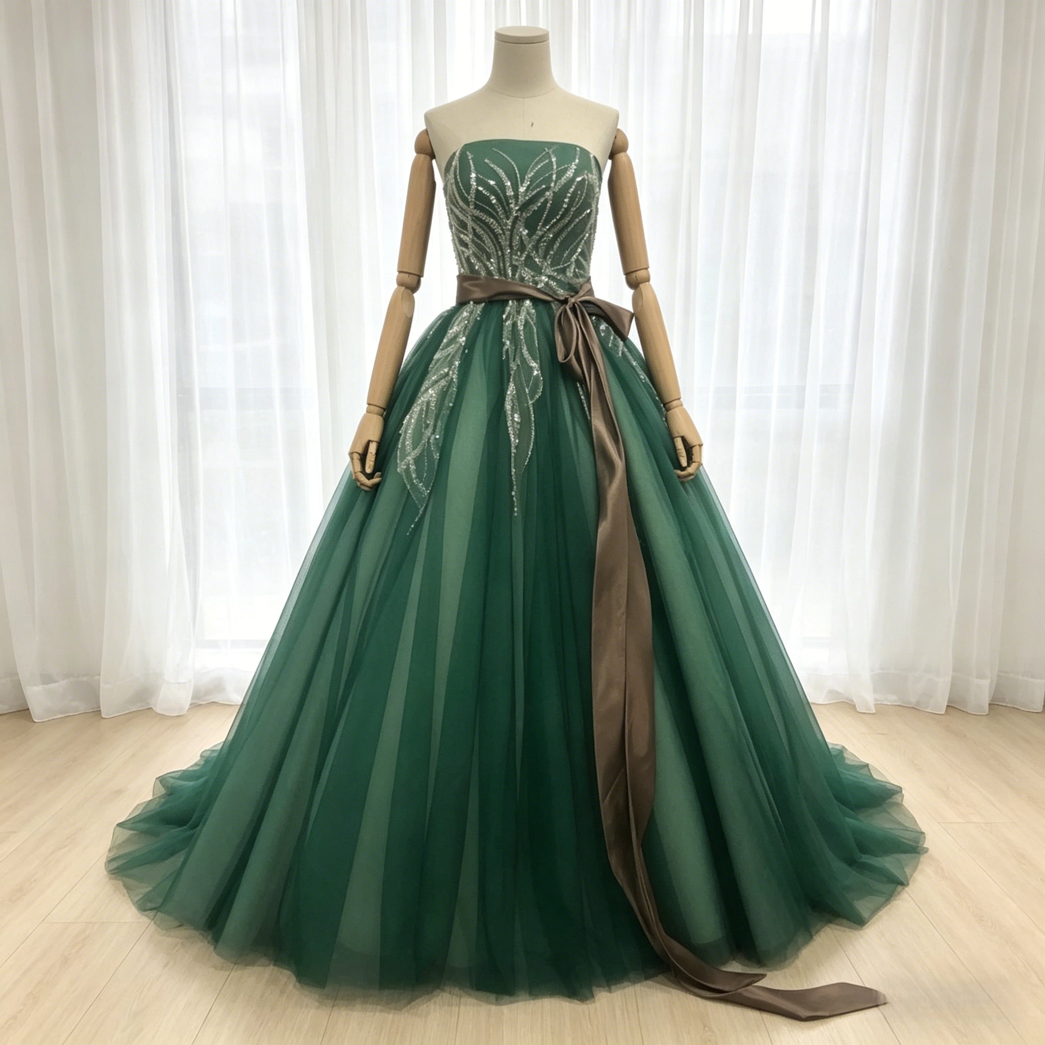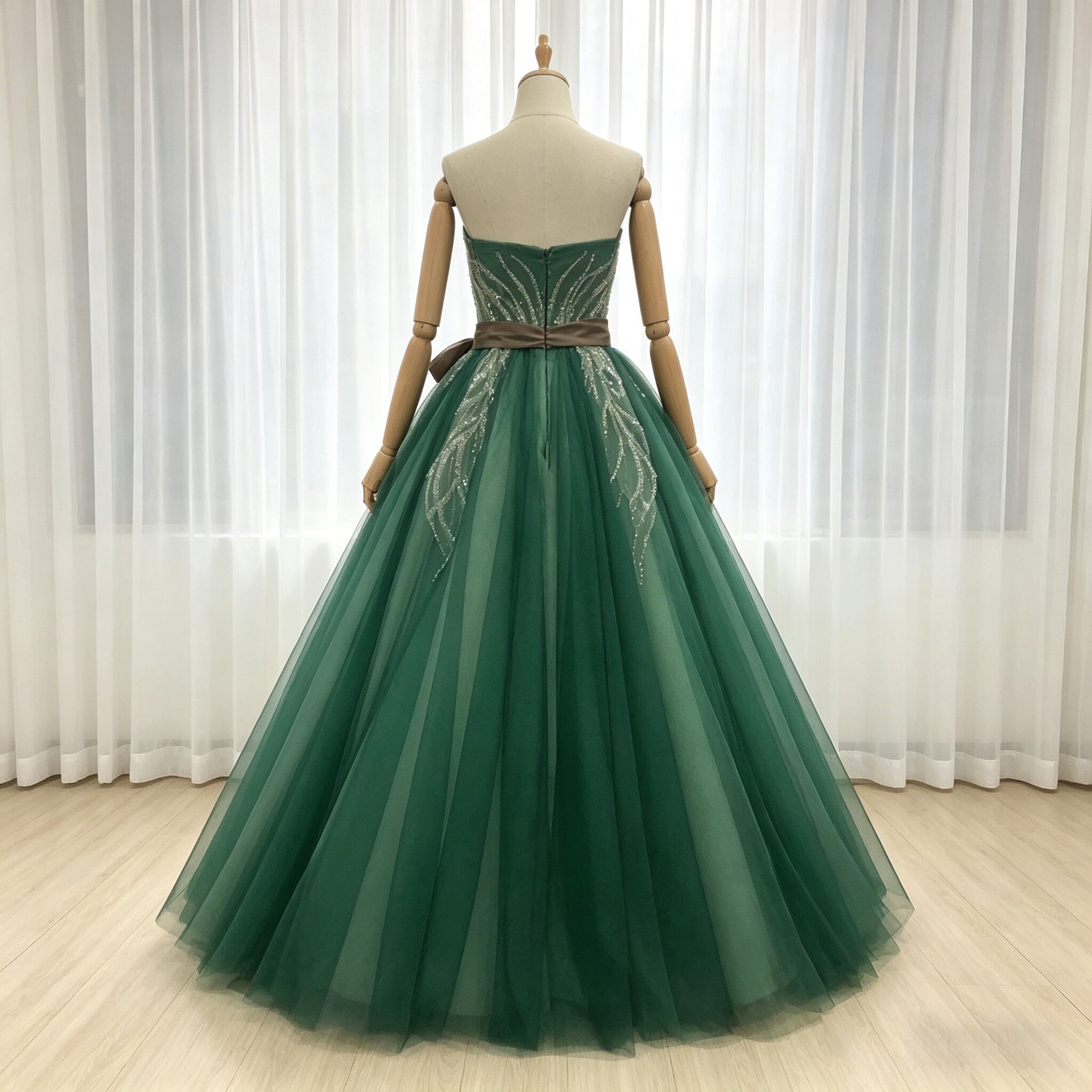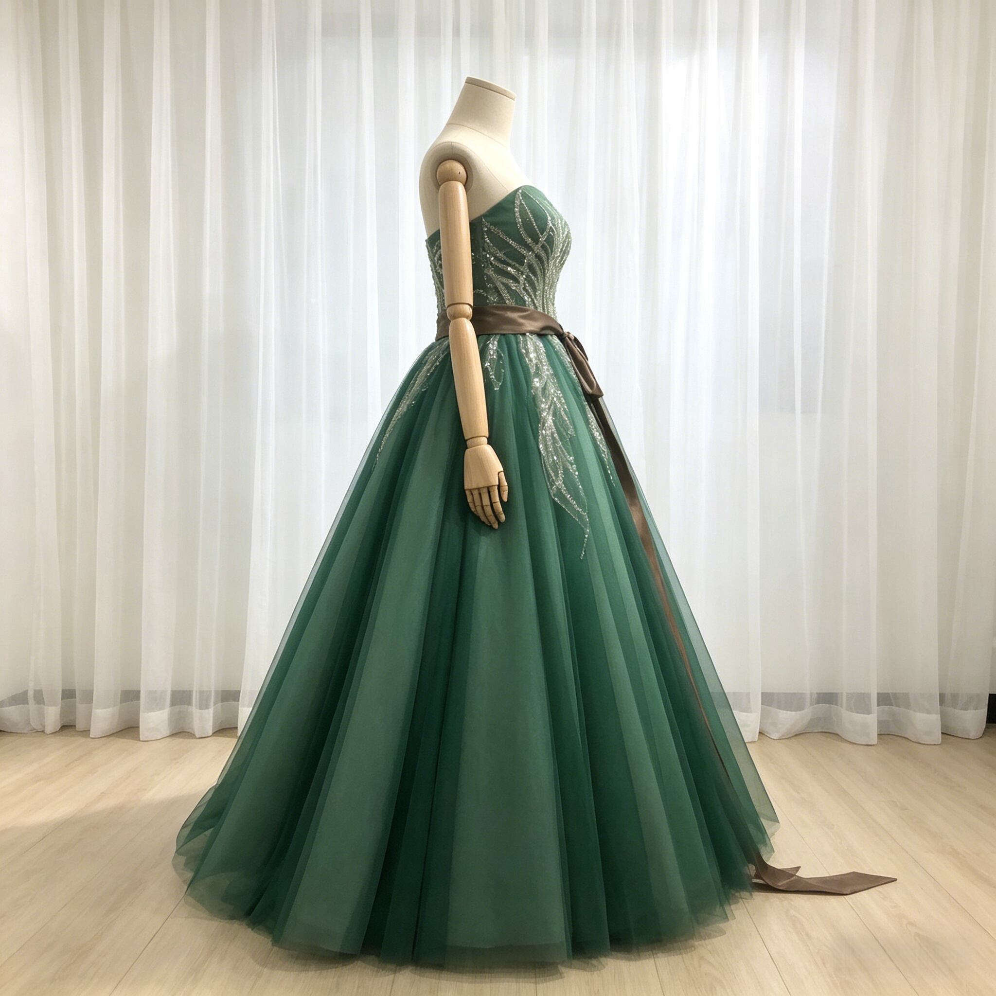 憧れのドレス カラードレス 緑 ベアトップ キラキラ光る刺繍 2次会/挙式 /謝恩会 エレガント