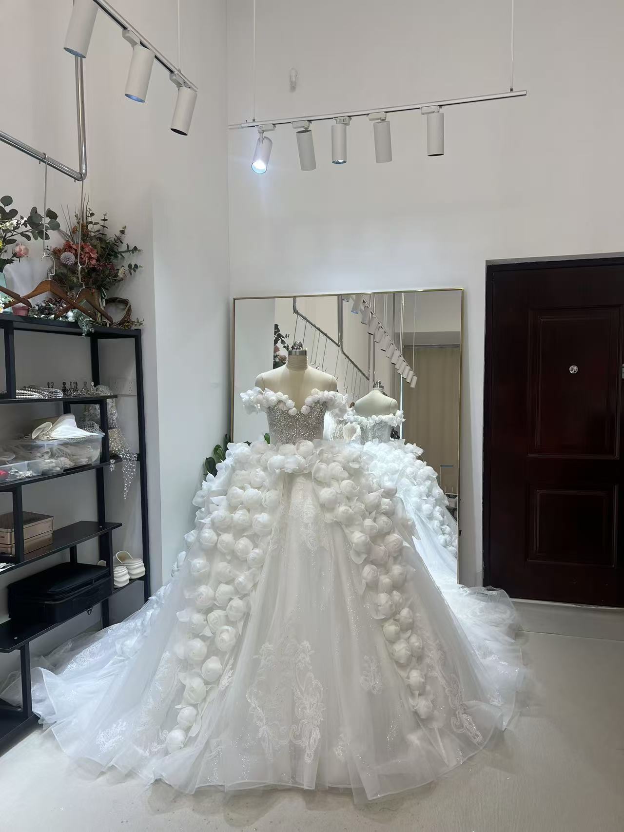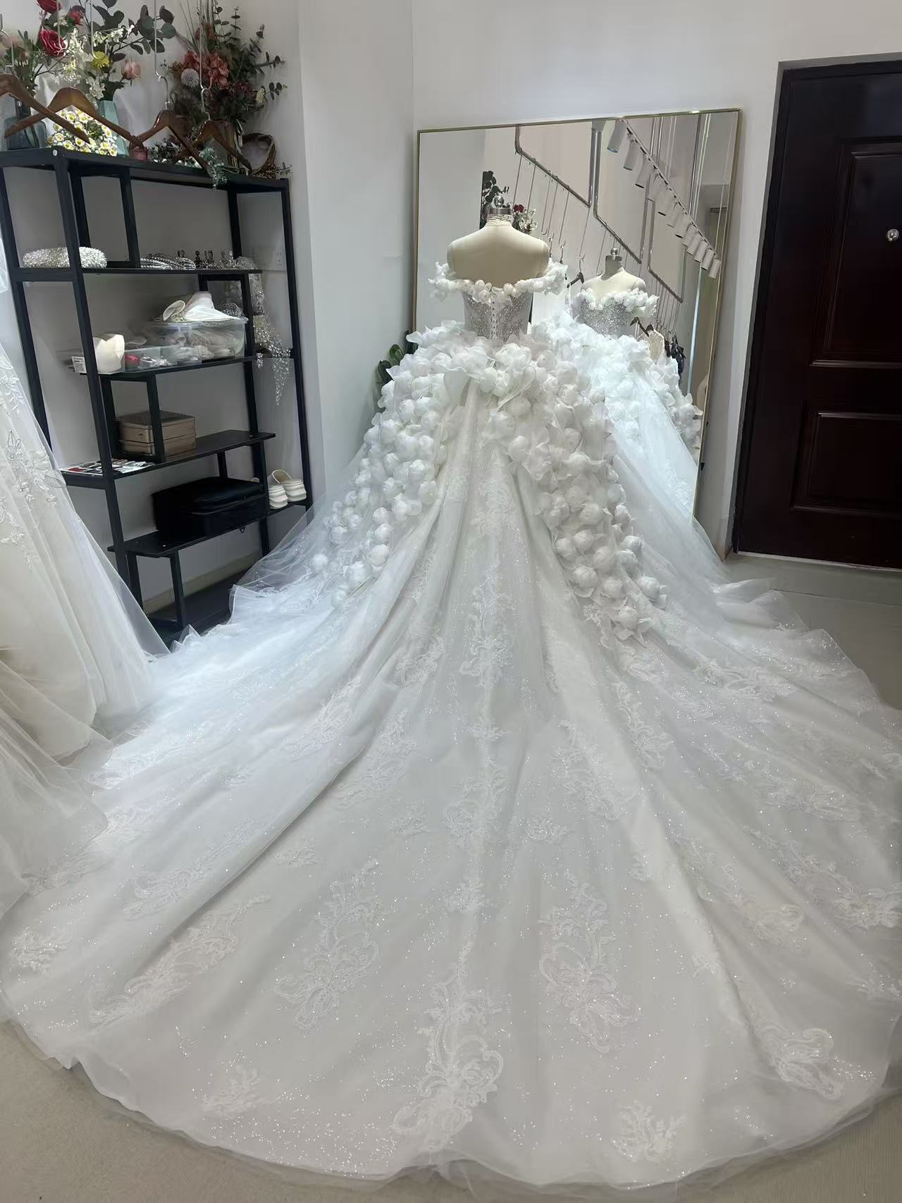 豪華!ウェディングドレス オフショルダー バラトレーン キラキラチュール ボリュームドレス ロングトレーン 拳式