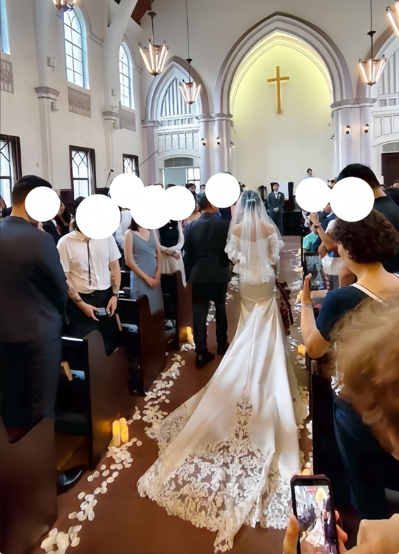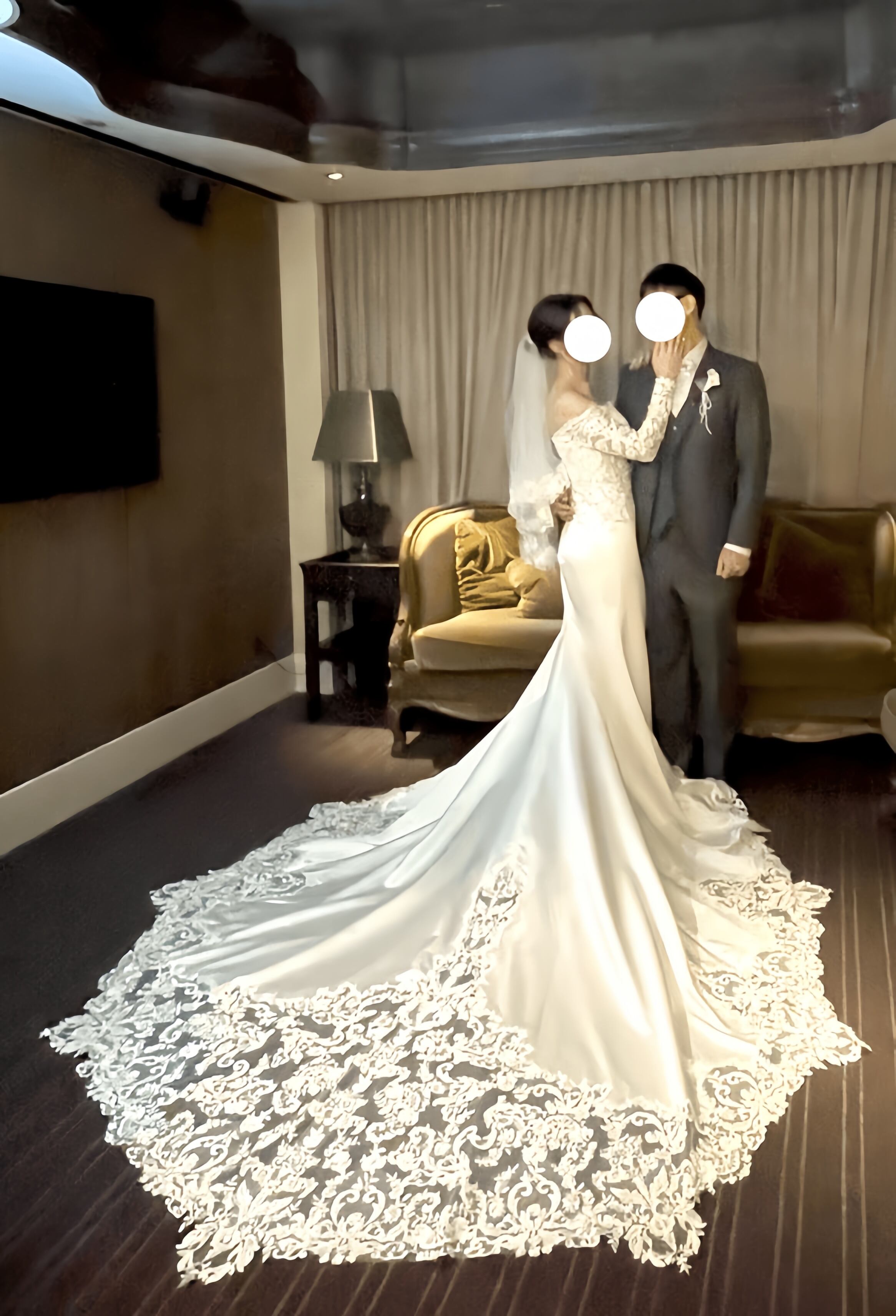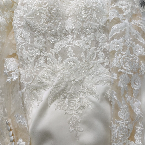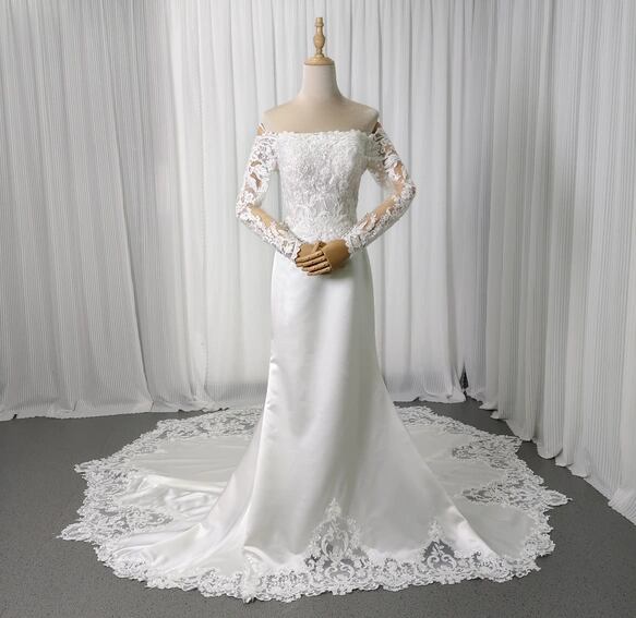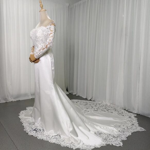 実例写真!ウェディングドレス オフショルダー キラキラ光る刺繍 マーメイドライン 華やかなトレーン 拳式/前撮り