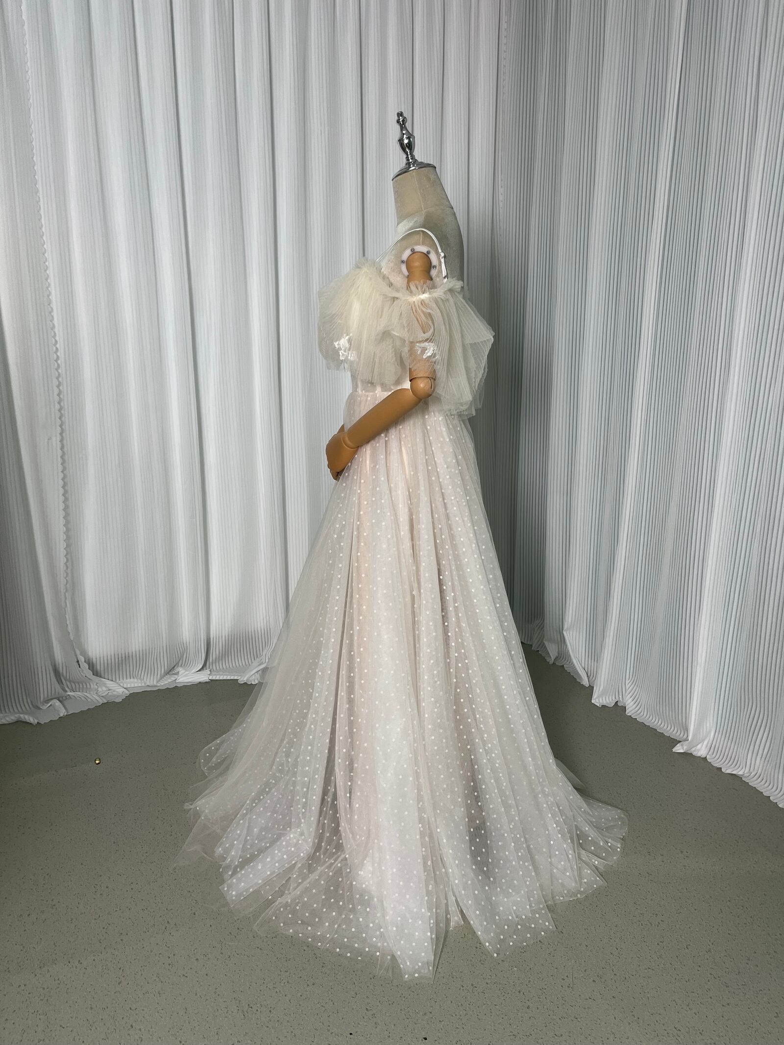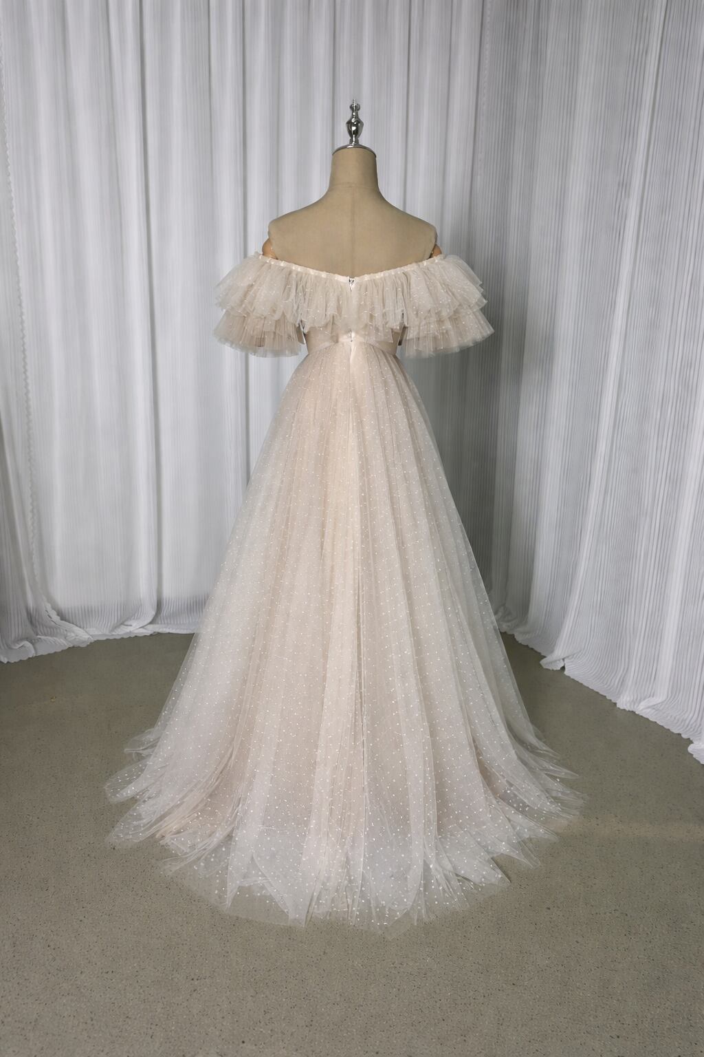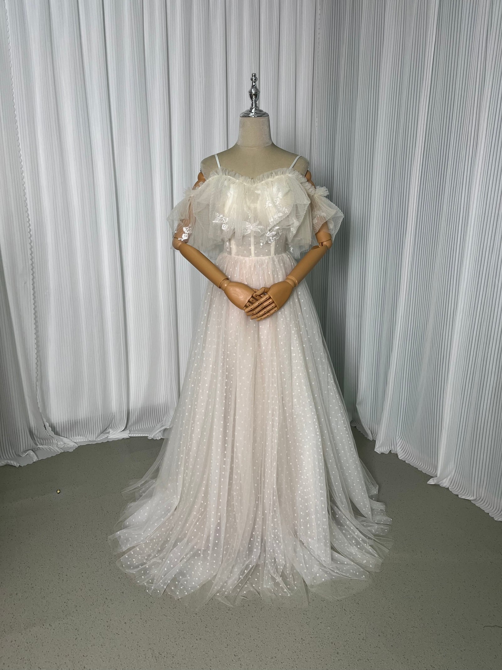 実例写真!パーティードレス シャンパン色 キャミソール 繊細レース ドットドレス プリーツスカート 花嫁