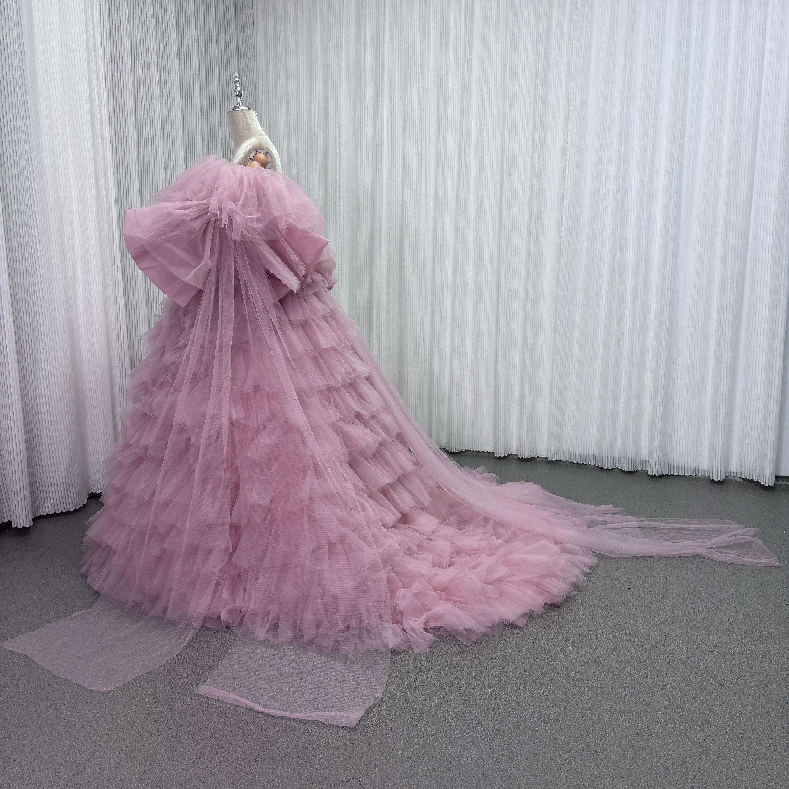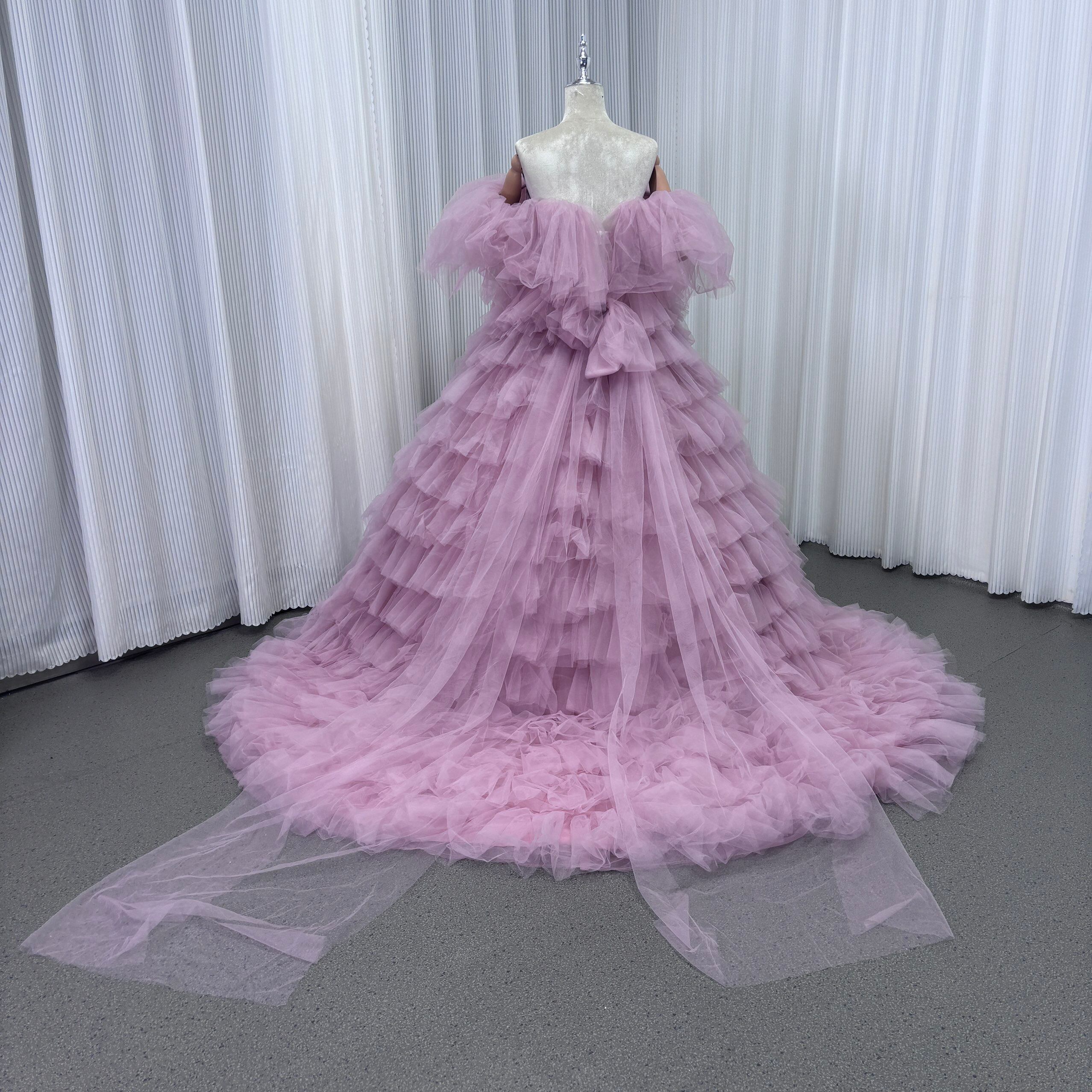 薄桃色 カラードレス オフショルダー リボンの袖 柔らかく重ねたチュールスカート 豪華なバックリボン 可愛い 前撮り