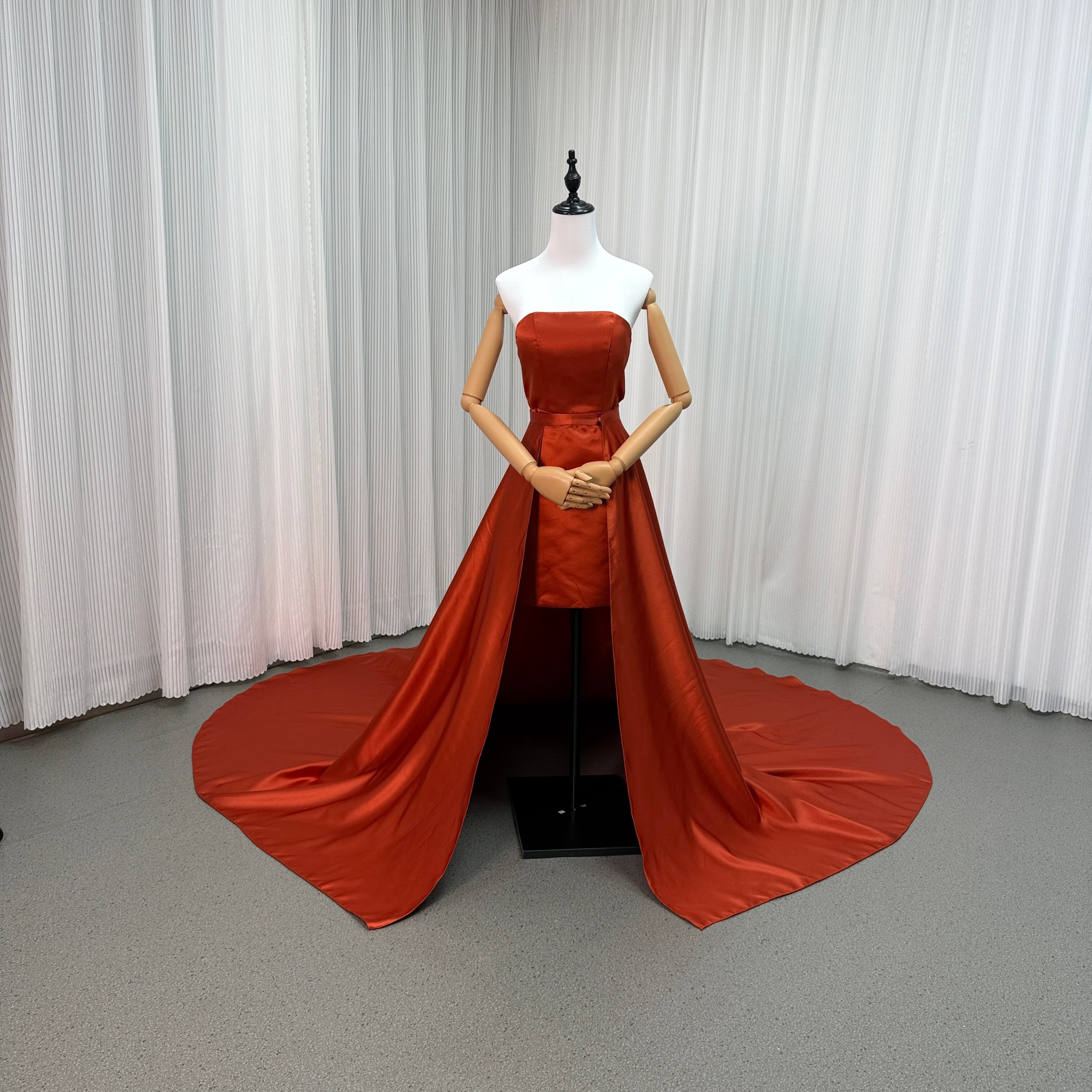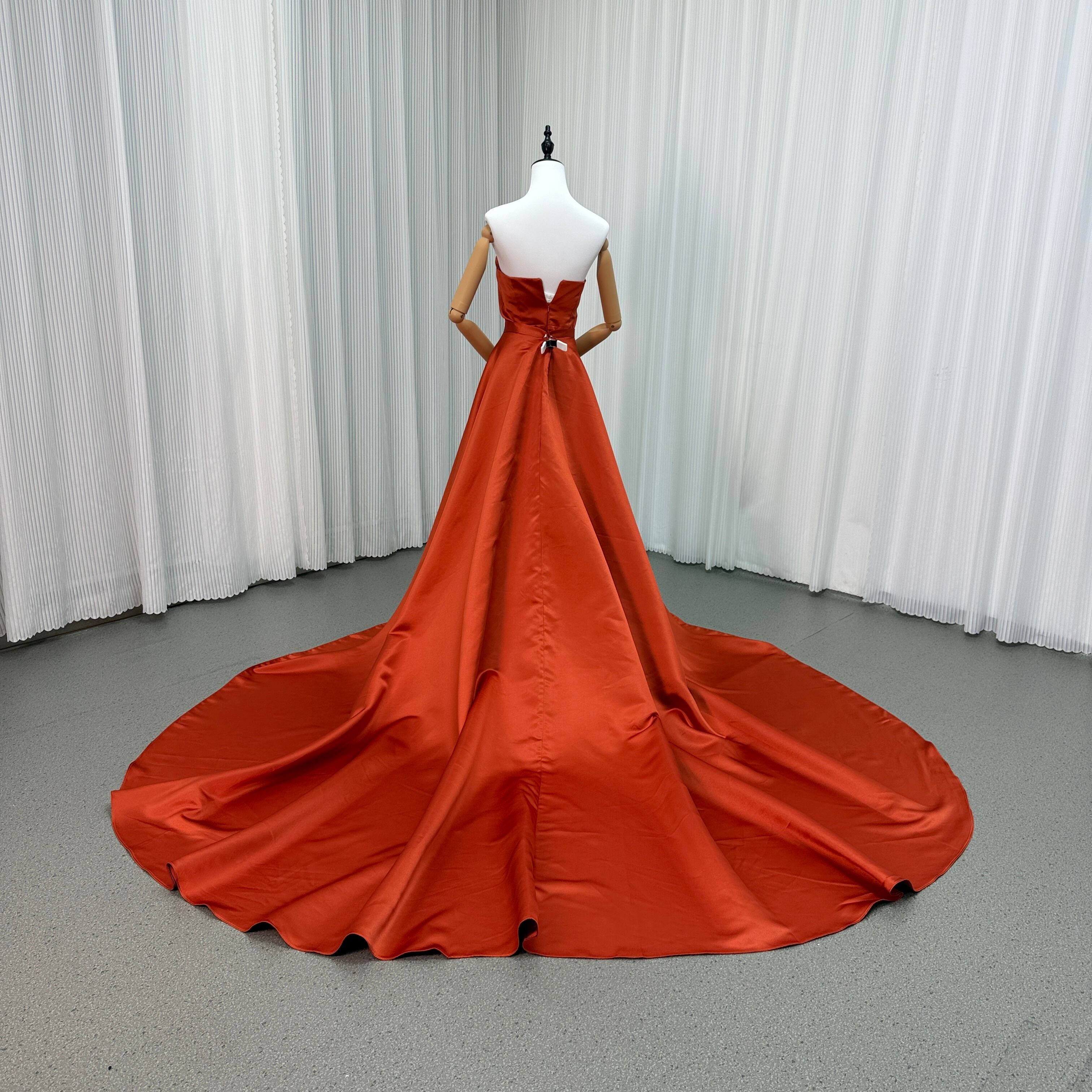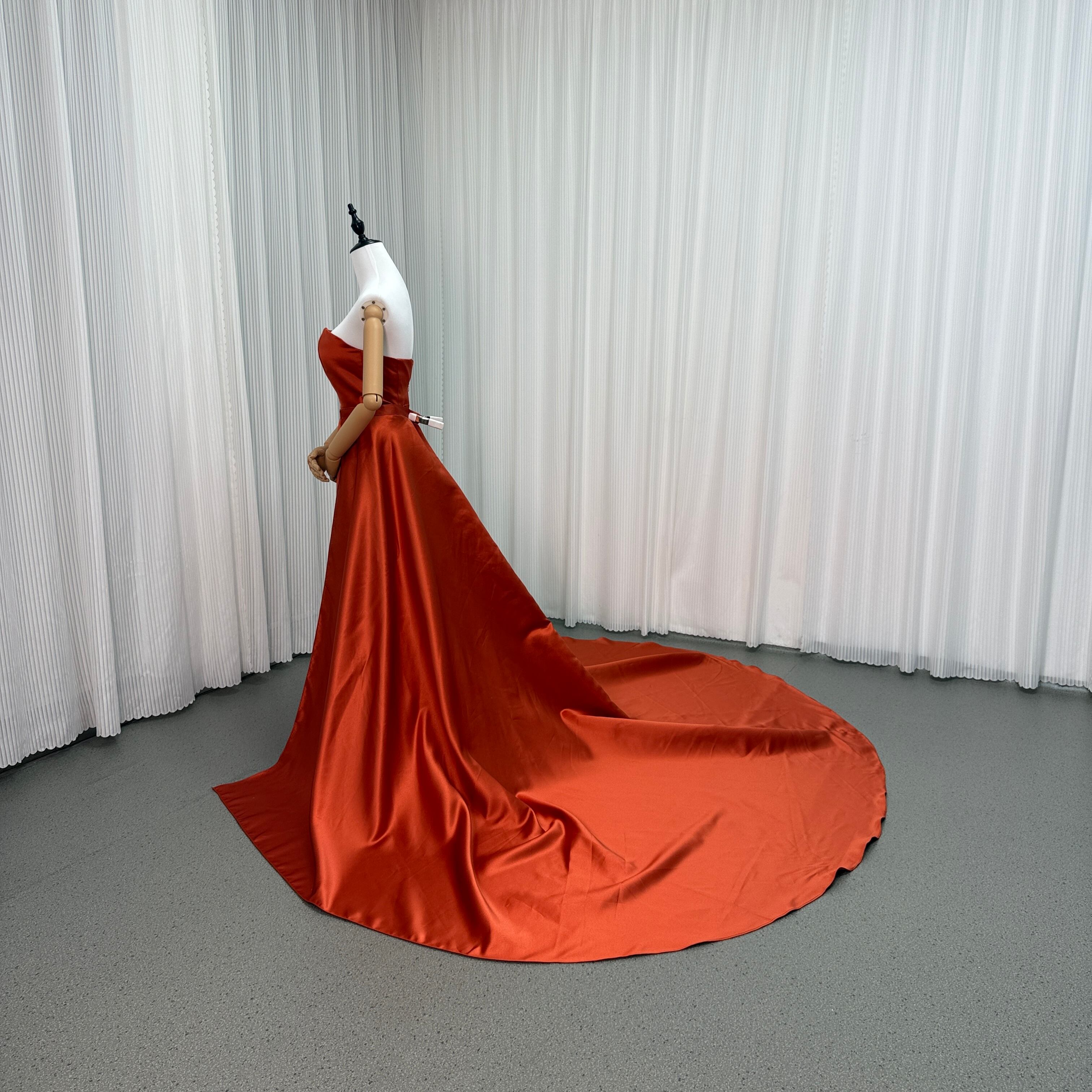 カラードレス テラコッタ色 ベアトップ 取り外しトレーン 光沢サテン 優雅なシルエット 披露宴